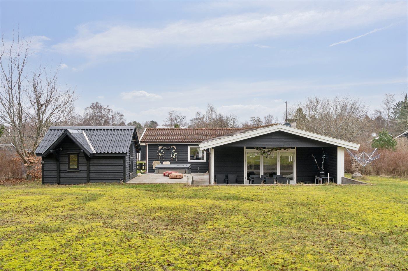 Ein Ferienhaus im gemütlichen Feriengebiet Rågeleje. Das Ferienhaus verfügt über einen Außen-Whirlpool, 3 Schlafzimmer und 2 Badezimmer. Eines der Schlafzimmer befindet sich in einem separaten Gästehaus. Das Haus liegt auf einem großen, eingezäunten Grundstück, das an ein Gelände mit Grabhügel aus der Bronzezeit angrenzt. Der Mittelpunkt des Hauses ist das große Wohnzimmer mit einer gemütlichen Sofaecke und einem großzügigen Esstisch. An kühleren Abenden kannst du den Kaminofen anheizen, Musik hören, einen Film schauen oder ein Spiel spielen. Vom Wohnzimmer aus gelangst du in ein geräumiges Schlafzimmer mit eigenem Badezimmer. Die Küche ist groß und komplett ausgestattet, damit du köstliche Mahlzeiten zubereiten kannst. Neben der Küche gibt es ein kleineres Schlafzimmer und ein zusätzliches Badezimmer. Das dritte Schlafzimmer befindet sich in einem charmanten kleinen Gästehaus. Zum Haus gehört eine riesige Holzterrasse mit zwei Essbereichen. Einer davon ist überdacht und mit einer Wärmelampe ausgestattet – perfekt für kühle Abende. Hier findest du auch einen großen Kugelgrill (Holzkohle) mit Rotisserie. Nach einer leckeren Mahlzeit im Freien kannst du dich im Außen-Whirlpool für sechs Personen entspannen, ein Glas Sekt genießen und dabei den Sternenhimmel bewundern.
