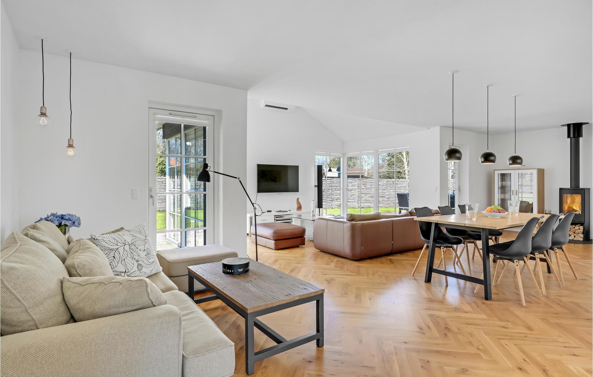 Kommen Sie mit befreundeten Familien in diese wunderbar eingerichtete Ferienunterkunft. Hier wird es Ihnen an nichts fehlen. Verbringen Sie gemeinsame, gesellige Stunden in der geräumigen Wohnküche und lassen Sie Ihre Kinder im Garten und auf dem Trampolin herumtollen. Sie finden auf der großen Terrasse sowohl sonnige als auch schattige Plätzchen. Wählen Sie je nach Wetterlage, ob Sie lieber im Freien oder am großen Esstisch neben dem Kamin speisen wollen. Ihnen stehen alle Möglichkeiten offen.