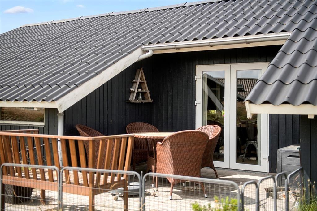 Besonders beeindruckend ist der Blick über Rindby von der nach Westen ausgerichteten Terrasse aus, besonders wenn die Sonne untergeht und den Himmel sowie das Ferienhausviertel in orangen-roten Farbtönen leuchten lässt. Auf dem Dünengrundstück steht auch ein Tisch-Bank-Set, an dem du Platz nehmen und die Natur genießen kannst. Für mehr Privatsphäre und Schutz vor Wind bietet sich die etwas kleinere, jedoch gemütliche Terrasse nach Süden an. Hochwertige Gartenmöbel sorgen für Komfort, und die kurze Distanz zur Küche erleichtert den Zugang für weitere Köstlichkeiten und Erfrischungen.