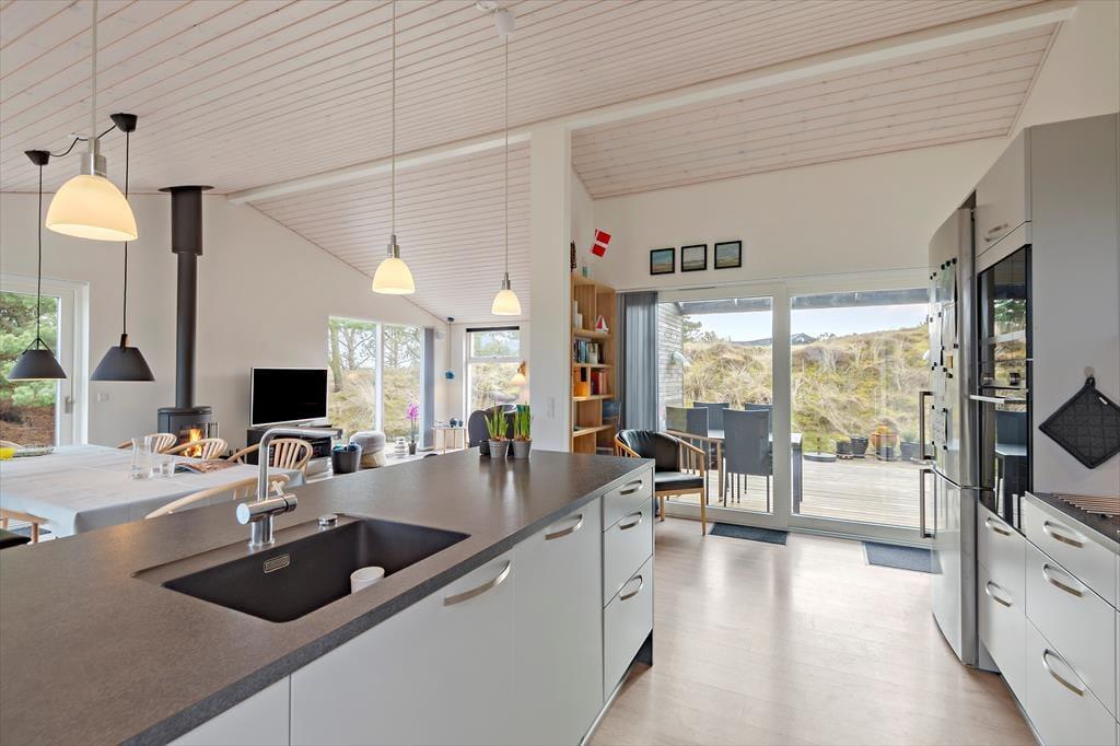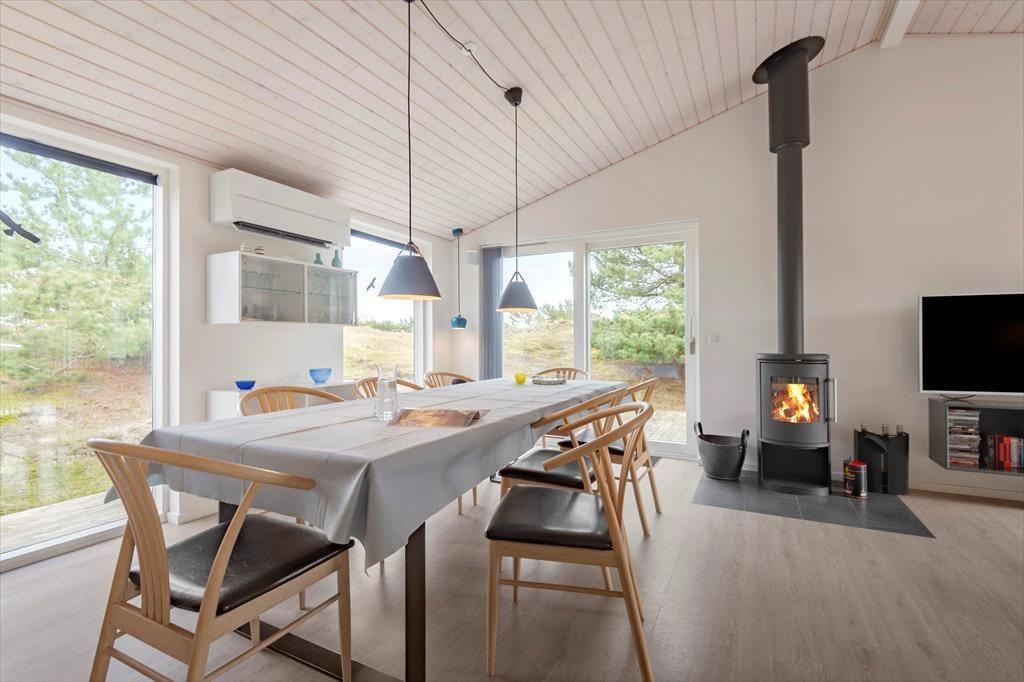 Der Grundriss des Ferienhauses ist durchdacht, sodass sowohl der Schlaf, das morgendliche Bad und die geselligen Momente in schöner Umgebung stattfinden können. Am einen Ende des Hauses befinden sich drei gute Schlafzimmer und zwei schöne Badezimmer – das bedeutet, dass du die Möglichkeit hast, dich zurückzuziehen und zu schlafen, auch wenn die anderen Lust haben, lange aufzubleiben, um Musik zu hören und Spiele im Wohnbereich zu spielen. Wenn ihr alle zusammen hier Zeit verbringt, habt ihr viel Platz sowohl zum Entspannen auf dem Sofa als auch für köstliche Mahlzeiten sowie zum Kochen in der offenen und gut ausgestatteten Küche. Es gibt einen Kaminofen im hellen und hoch aufragenden Raum, und die großen Fenster sorgen dafür, dass sowohl die Sonne als auch die Natur vollständig hereingeladen werden.