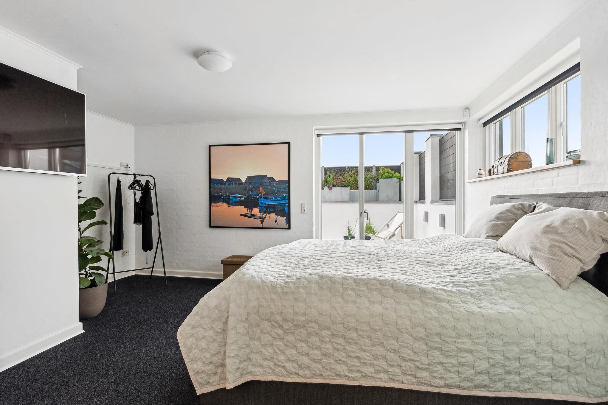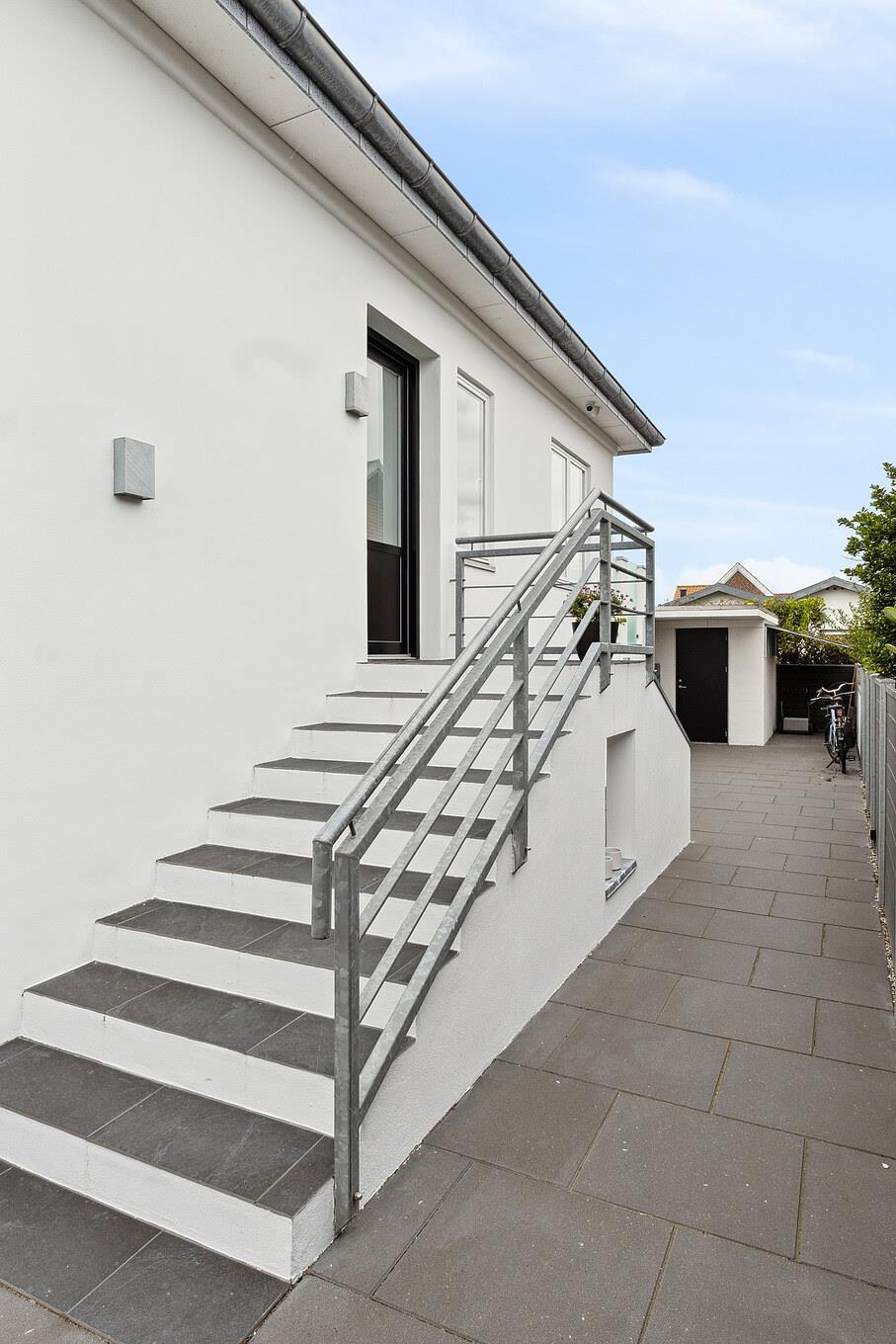 Draußen erwarten Sie mehrere sonnige und einladende Terrassenbereiche. Vom Küchenbereich aus gelangen Sie direkt auf eine erhöhte Holzterrasse mit westlicher Ausrichtung und einem atemberaubenden Blick auf den Fjord – ideal für den Morgenkaffee oder ein Glas Wein bei Sonnenuntergang. Eine schöne Treppe führt hinunter in den gemütlichen, sonnigen Innenhof, der sich leicht mit Loungemöbeln gestalten lässt. Eine weitere Terrasse in Südlage bietet Sonne vom frühen Morgen bis in den Nachmittag.