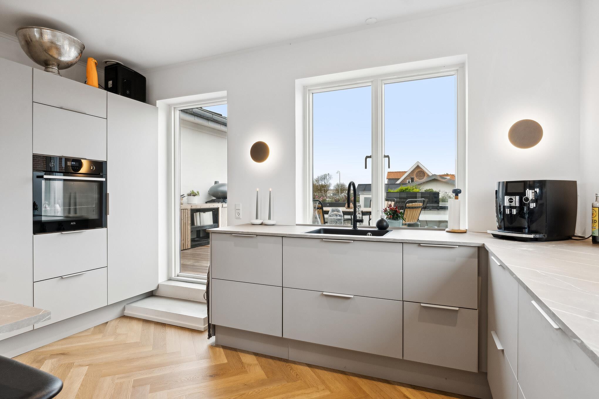 Das Haus verfügt über einen hellen und stilvollen Wohn- und Essbereich mit moderner Ausstattung, eleganten hellgrauen Elementen und viel Stauraum. Der schöne Fischgrätparkettboden zieht sich bis in das angrenzende Wohnzimmer, wo große Fenster viel Tageslicht hereinlassen und einen herrlichen Blick auf den Fjord bieten. Hier lässt es sich wunderbar gemeinsam essen, entspannen oder einfach die ruhige Atmosphäre genießen.
