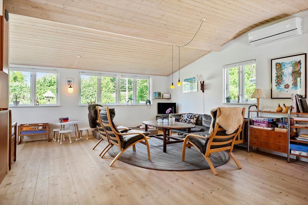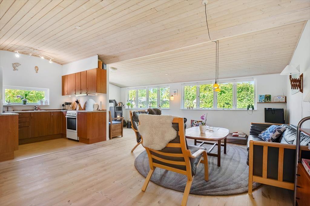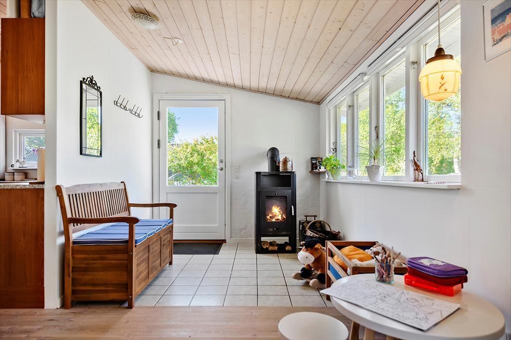 Dieses charmante und sehr gut erhaltene Ferienhaus verfügt über ein großes Wohnzimmer mit hellen Holzfußböden und in der Sofaecke gibt es weiche Möbelstücke, wo die ganze Familie nach einem Tag mit Erlebnissen und frischer Luft sich entspannen kann. Im Wohnzimmer gibt es einen Kamin, der das ganze Haus wärmt. In der Waschküche gibt es eine Waschmaschine. Das Haus verfügt über zwei gute Schlafzimmer. Das eine mit einem Doppelbett und das andere mit zwei Einzelbetten. Das Haus bietet auch einen Kinderstuhl, Kinderbett, Kinderbadewanne, Sandkasten und Schaukel.