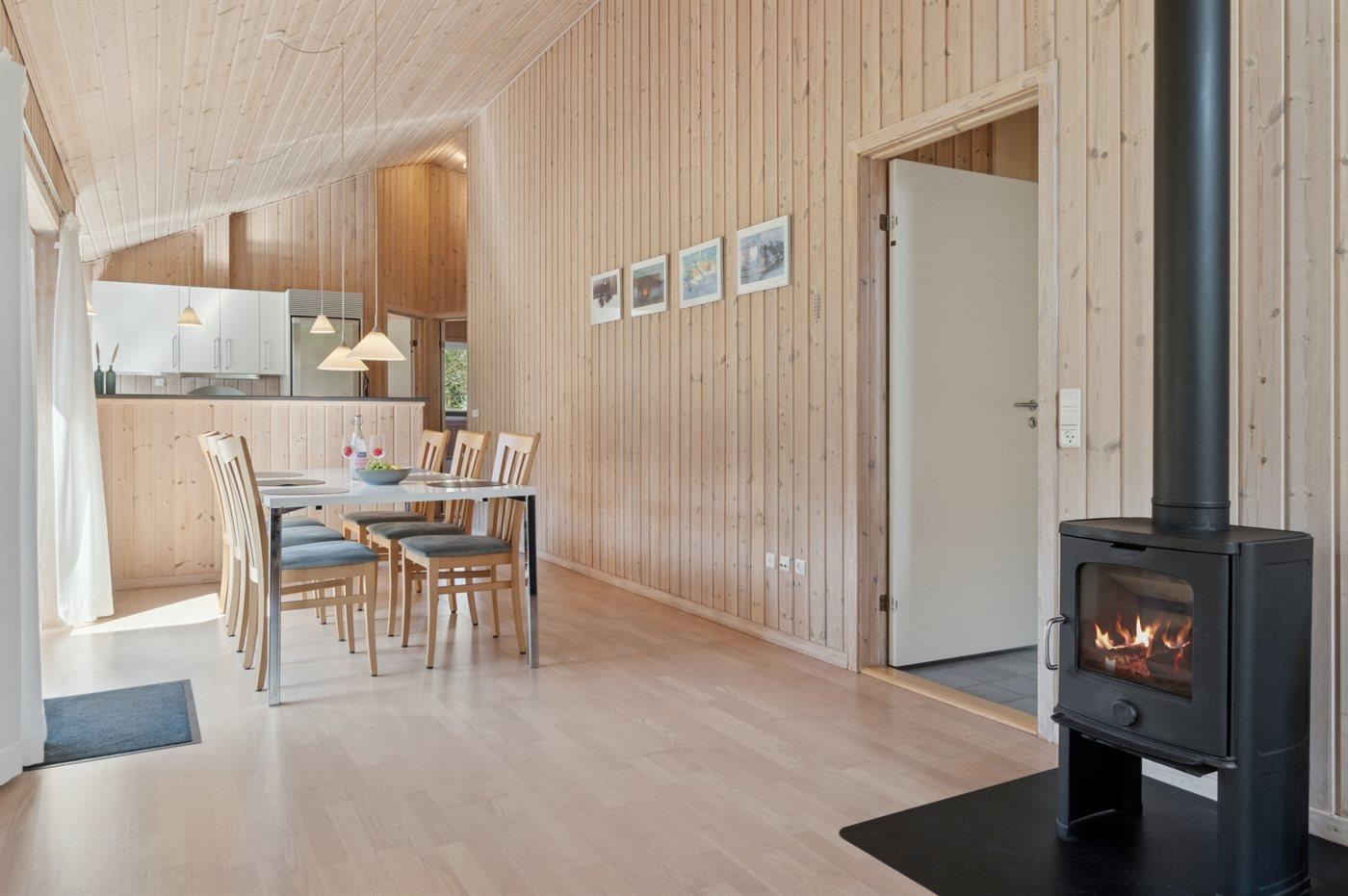 Es gibt ein geräumiges Ess- und Wohnzimmer mit bequemen Möbeln und einem Kaminofen. Eine neue, effiziente Wärmepumpe wurde 2022 installiert. Natürlich hast du in diesem wunderbaren Haus kostenloses WLAN. Vom Wohnzimmer aus gelangst du direkt auf die große Terrasse, auf der du viele entspannte Ferienstunden in den hochwertigen Gartenmöbeln genießen kannst.