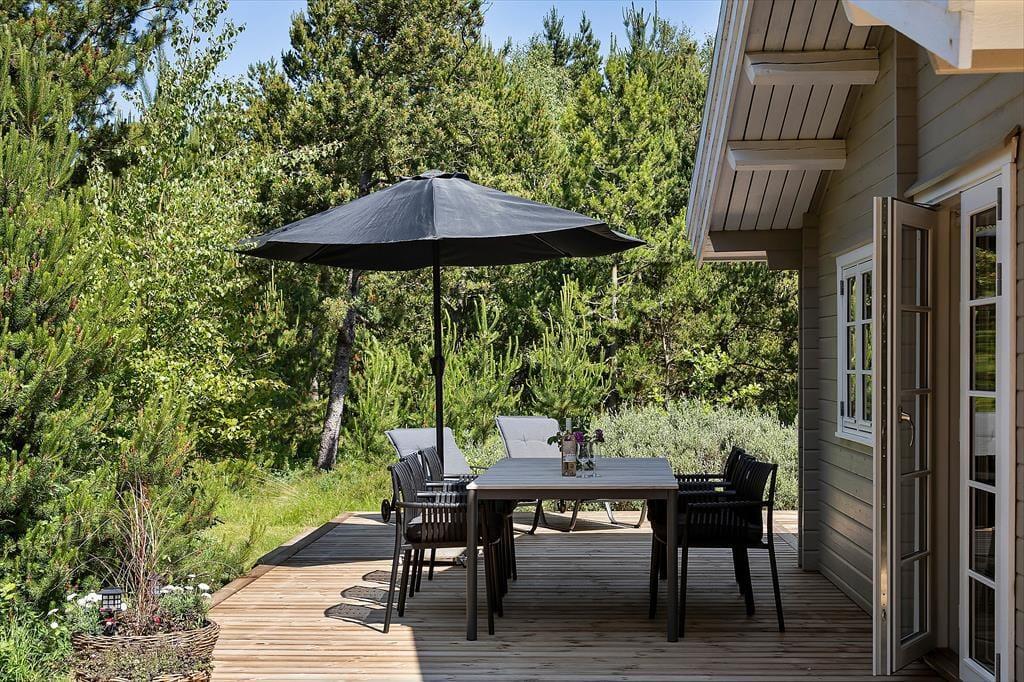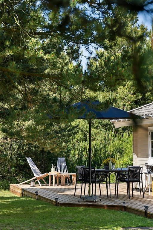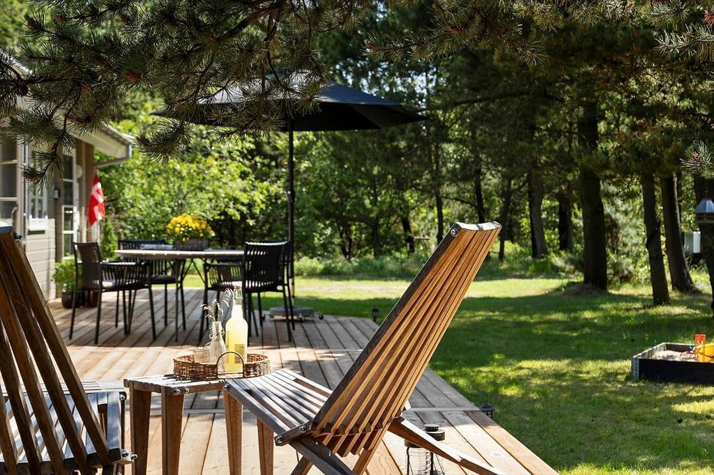 Das Naturgrundstück misst außerdem 2.800 m², sodass genügend Platz zum Spielen auf der Rasenfläche und zum Entspannen auf der großen Holzterrasse vorhanden ist, die sich um zwei Seiten des Ferienhauses schmiegt. Das Leben im Freien kann hier ungestört stattfinden, dank der Kiefern, die auch etwas Schutz bieten, falls es windig sein sollte. Auch das Auto hat gute Bedingungen, denn es kann im Carport geparkt werden.