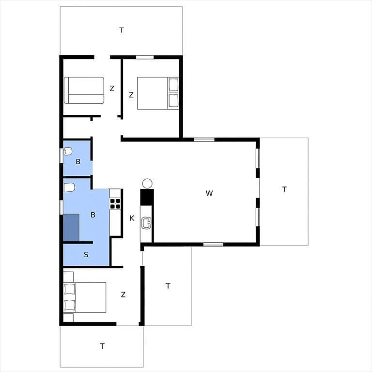 Wenn Sie mit Kindern in den Urlaub fahren, bietet das Ferienhaus eine wunderbare Umgebung zum Spielen und für gemütliche Momente. Auch an die praktischen Details wurde gedacht, denn in der Eingangshalle gibt es eine Waschmaschine und einen Wickelraum für die kleinsten Urlauber, und der Grundriss umfasst sowohl eine Gästetoilette als auch ein Badezimmer. Das Badezimmer verdient ein paar extra Worte, denn hier werden Sie sowohl mit einem Whirlpool als auch mit einer Sauna verwöhnt, sodass Sie Ihren Urlaubstag mit entspanntem Wellness ausklingen lassen können. Alternativ können Sie den Kaminofen im Wohnzimmer anfeuern, in der offenen Küche Tee oder Kaffee kochen und es sich auf dem Ecksofa gemütlich machen.