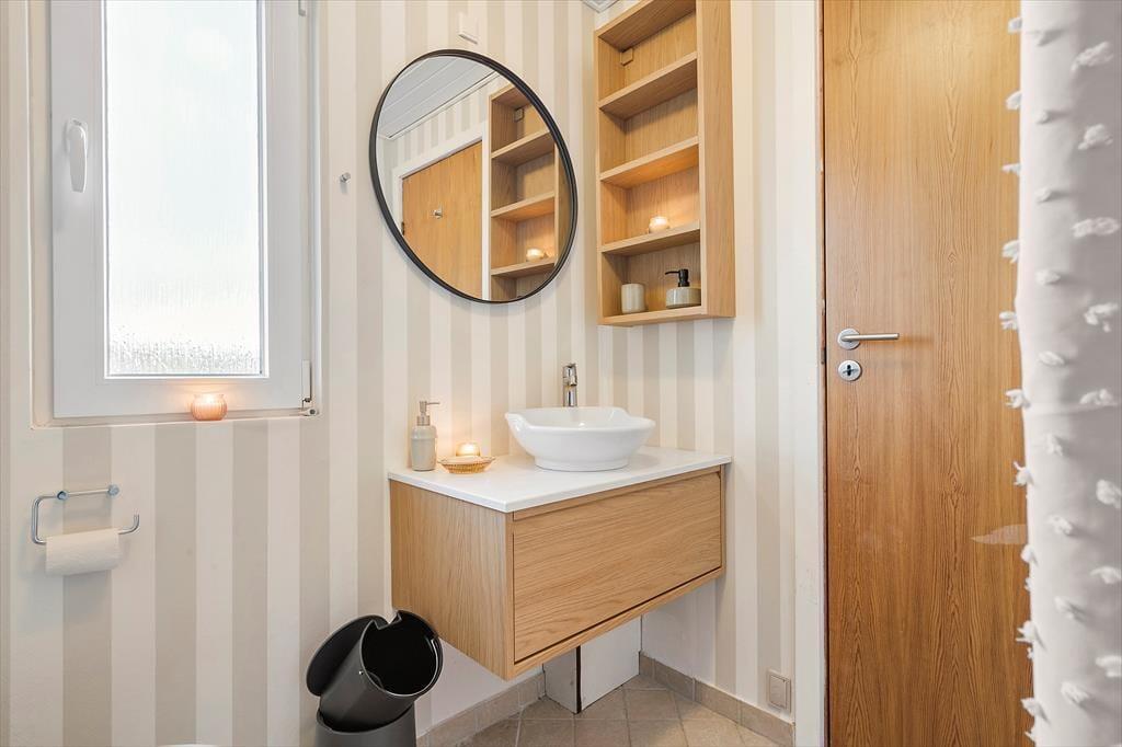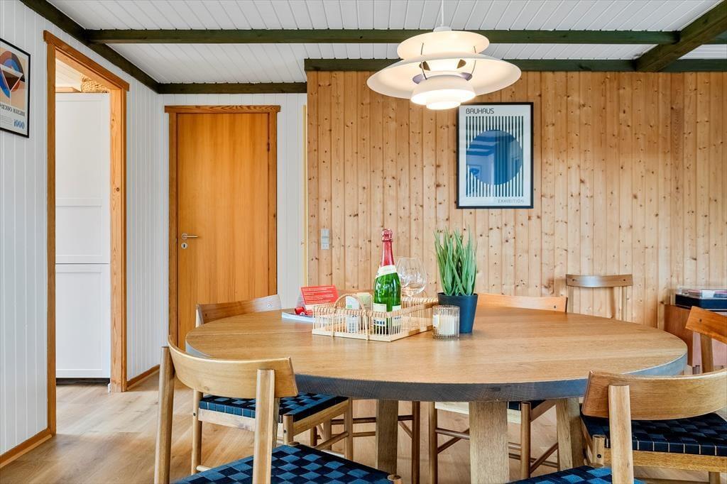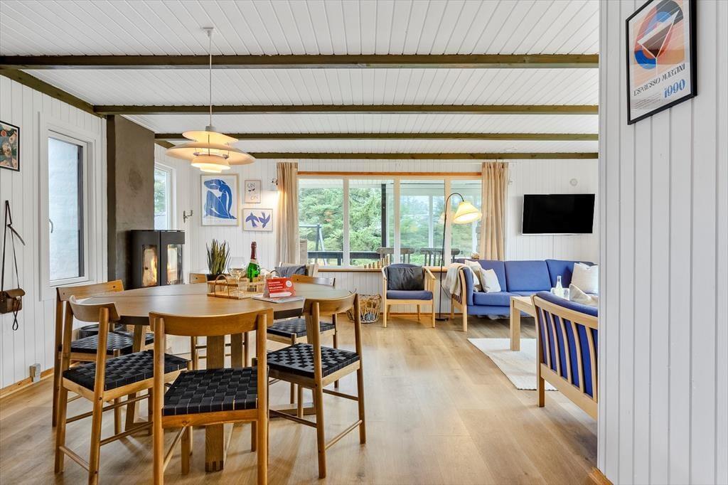 Das Sommerhaus, ein klassisches Sommerhaus aus Holz aus dem Jahre 1977, wurde noch nie zuvor zur Vermietung genutzt, und es ist deutlich zu erkennen, dass die Eigentümer sich gut um das Haus gekümmert haben. Eine gründliche Renovierung im Jahre 2023 umfasst neu-gestrichene Wände und Decken. Dazu sorgen neue Möbel dafür, dass Sie sich im Haus wohlfühlen. In der neuen Küche können Sie sich auf das Kochen köstlicher Speisen freuen. Dank der offenen Verbindung zum Wohnzimmer müssen Sie auch dann nicht auf das gemütliche Gespräch verzichten, wenn in den Töpfen gerührt werden muss. Im Wohnzimmer gibt es sowohl einen Holzofen als auch eine Wärmepumpe, falls Sie an kühlen Tagen und Abenden zusätzliche Wärme benötigen. Drei gute Schlafzimmer befinden sich in der Nordecke vom Haus, und vom Eingang aus haben Sie Zugang zum schönen Duschbad des Hauses.