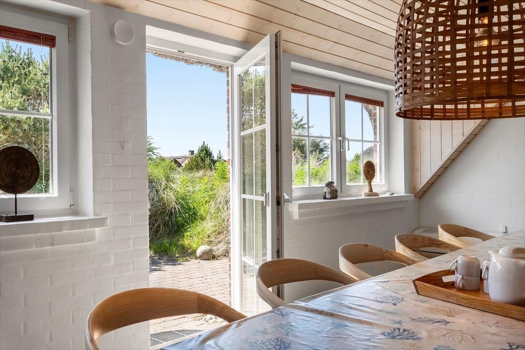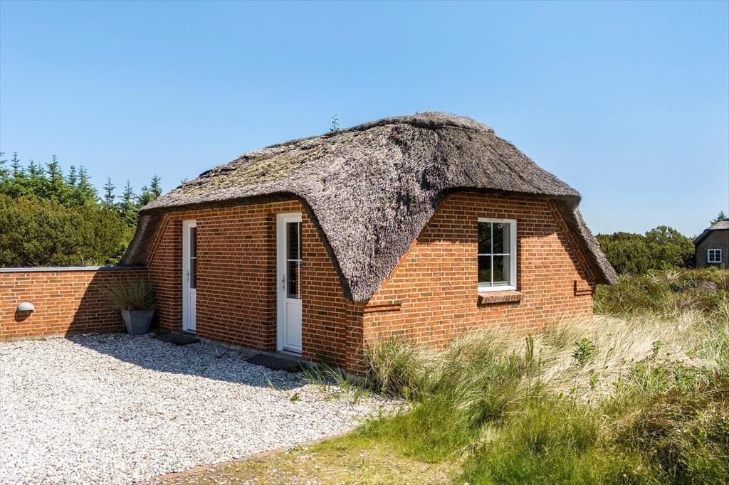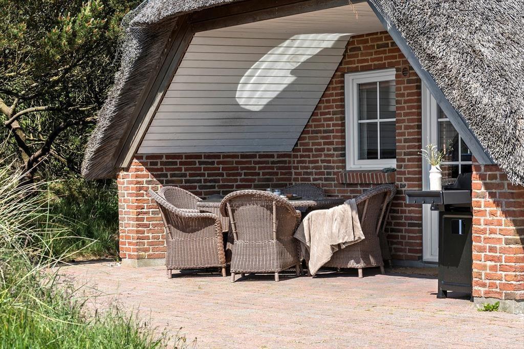 Sowohl das Sommerhaus als auch das dazugehörige Nebengebäude sind mit Strohdächern ausgestattet, sodass sich die Gebäude wunderbar in die wilde Vegetation des Naturgrundstücks und der Dünenlandschaft einfügen. Rund um das Haus stehen Ihnen mehrere schöne Terrassen und Sonnenplätze zur Auswahl, und da es sowohl im Wohnzimmer als auch im Esszimmer eine Gartentür gibt, können Sie bei Sonnenschein problemlos hinausschlüpfen. Wenn Sie Schatten benötigen oder bis in die späten Abendstunden im Freien sitzen möchten, kann das Abendleben in den überdachten Bereich der Terrassenumgebung verlagert werden. Neben Gartenmöbeln und Liegestühlen ist die Terrassenumgebung mit einem Grill ausgestattet, und auf der Kiesfläche haben Sie ausreichend Platz, Ihre Autos zu parken.