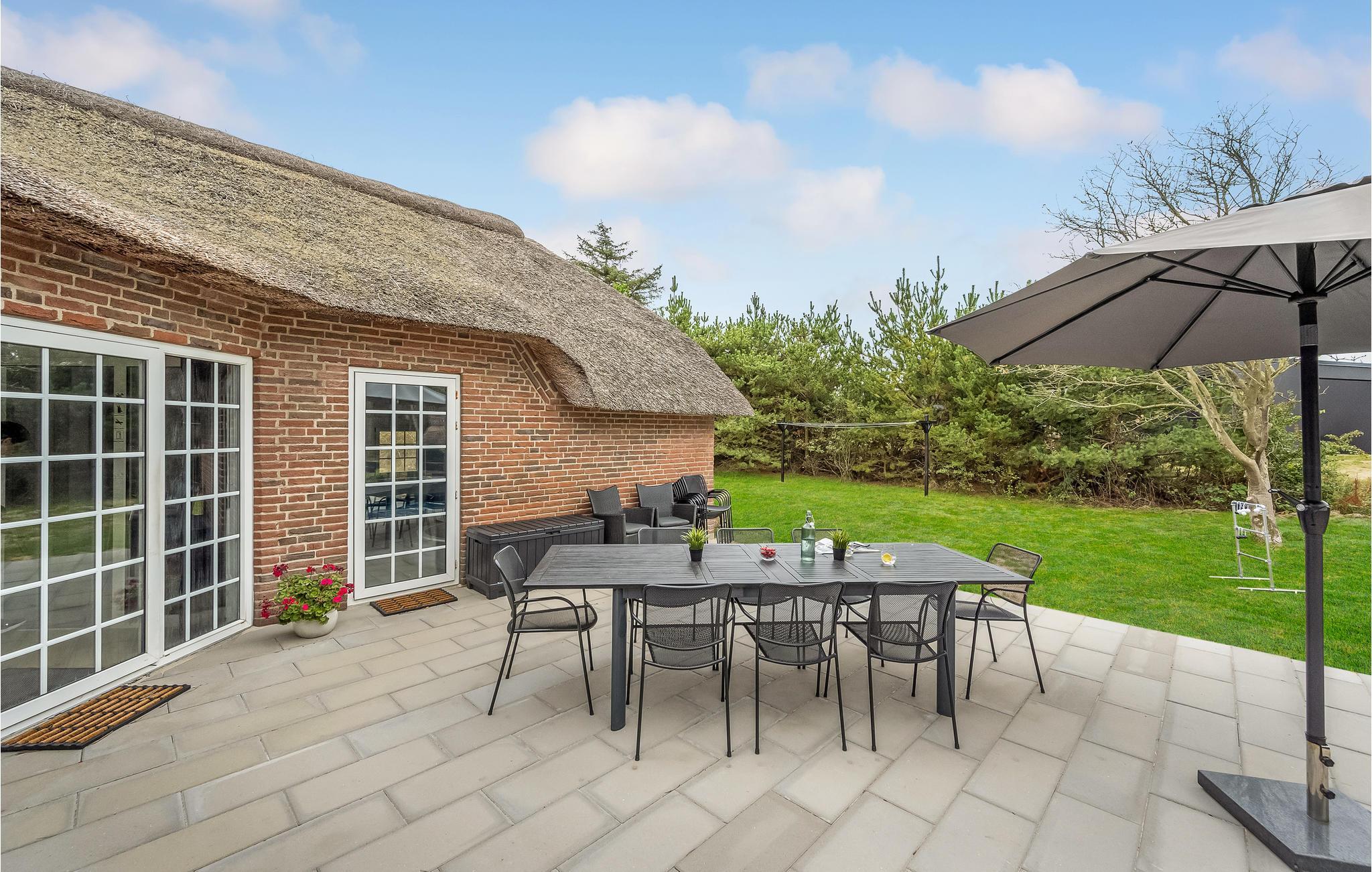 Nur zweieinhalb Kilometer vom beliebten Badeort Søndervig entfernt liegt dieses Ferienhaus mit seinem schönen Schilfdach. Es ist für 14 Personen ausgestatten und bietet daher auch der großen Familie viel Platz. Oder auch zwei Familien, denn aufgeteilt auf zwei Bereiche sind die sechs Schlafzimmer zu finden. In der Mitte liegt die geräumige Wohnküche. Im Haus sind auch zwei Badezimmer und ein schöner Poolbereich mit Whirlpool und Sauna. Auch ein Billiardtisch ist vorhanden. Eine sonnige Terrasse erwarten Sie vor dem Haus und die Kinder finden Gelegenheiten sich auf dem Grundstück zu tummeln. Søndervig ist für seine Lage an der Nordsee und die beeindruckenden Sandskulpturen bekannt. Auch gut einkaufen können Sie, Minigolf spielen und mehrere gute Spielplätze mit den Kindern besuchen. Von der Mole können Sie angeln.