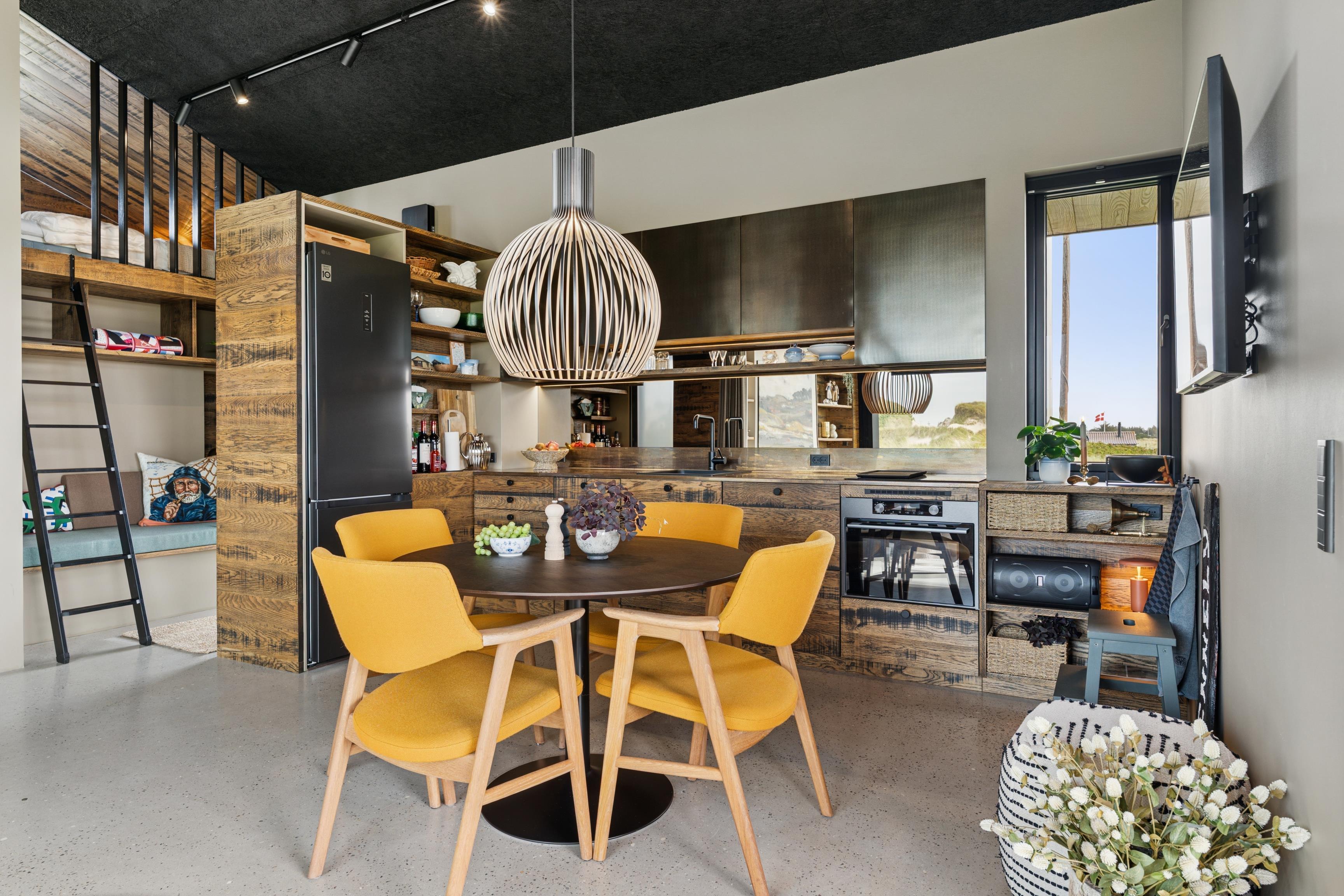 Die Einrichtung ist hell, modern und äußerst geschmackvoll mit stilvollen Möbeln, natürlichen Materialien und einer einladenden Farbgestaltung. Es gibt Schlafplätze für 4 Personen – zusätzlich kann eine weitere Schlafmöglichkeit in der Alkove vorbereitet werden, perfekt für ein Kind. Die gut ausgestattete Küche ist offen mit dem Essbereich und dem Wohnzimmer verbunden, wo sowohl Komfort als auch Gemütlichkeit im Mittelpunkt stehen. Große Panoramafenster sorgen für viel Licht und lassen die Natur Teil des Wohnraums werden. Egal, wo Sie im Raum sitzen, Sie blicken auf ein lebendiges Gemälde, das sich ständig verändert.