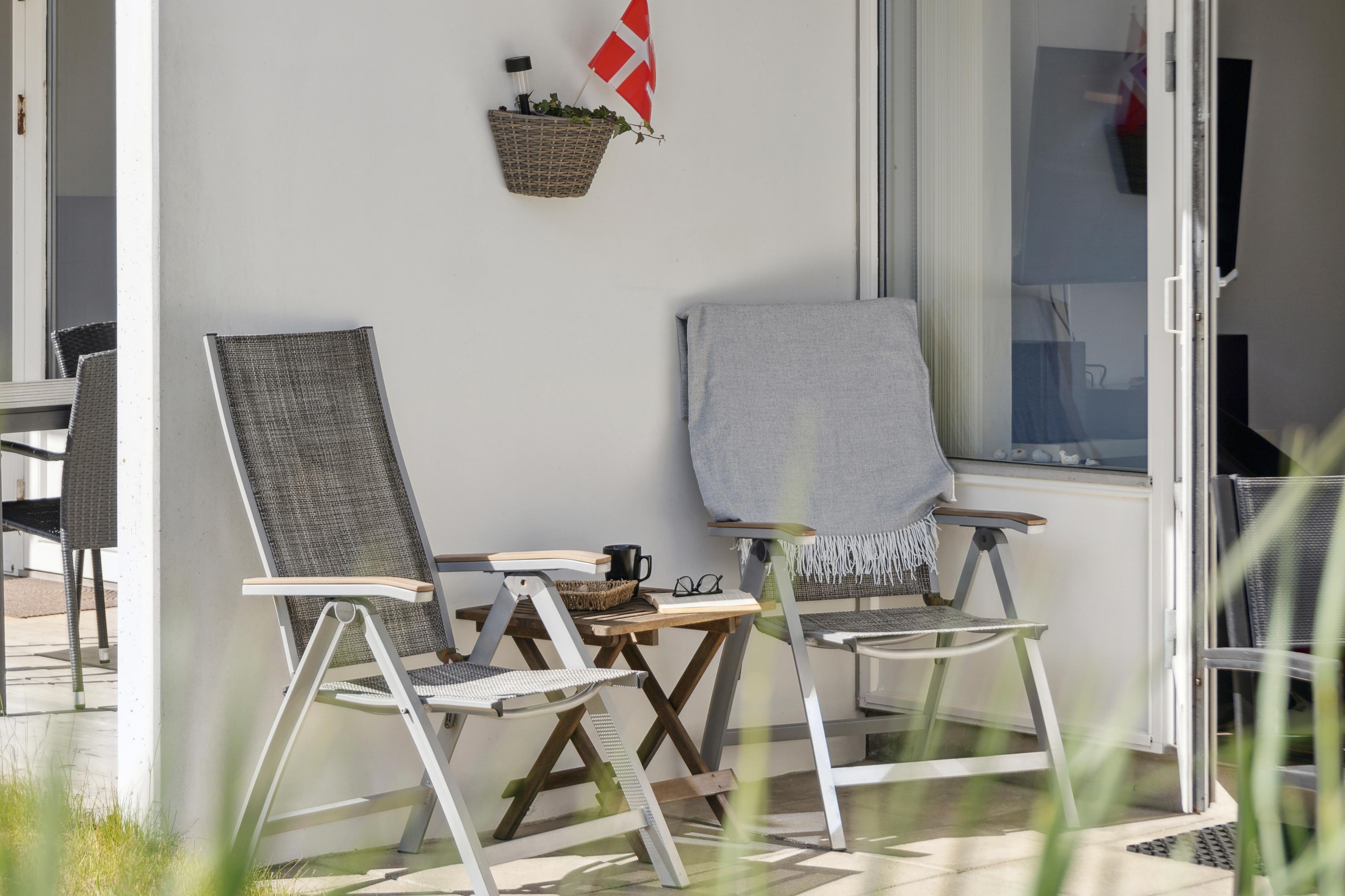 Vom Wohnzimmer aus gelangt ihr auf eine überdachte Terrasse, auf der ihr am Tisch zusammen sitzen und eure Urlaubsmomente genießen könnt – vielleicht mit dem Klang der Wellen die von der Nordsee herüberschallen als Hintergrundmusik.
