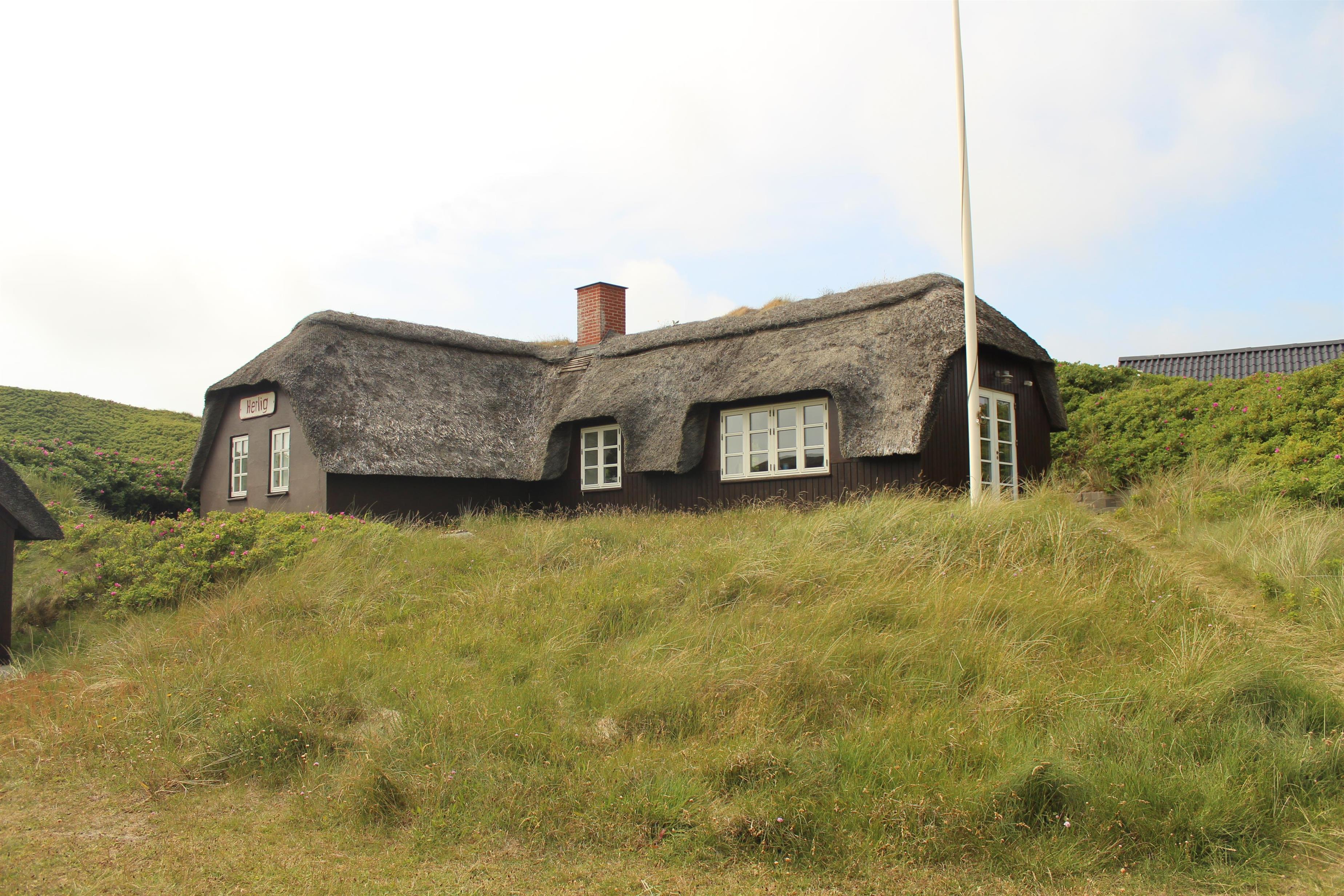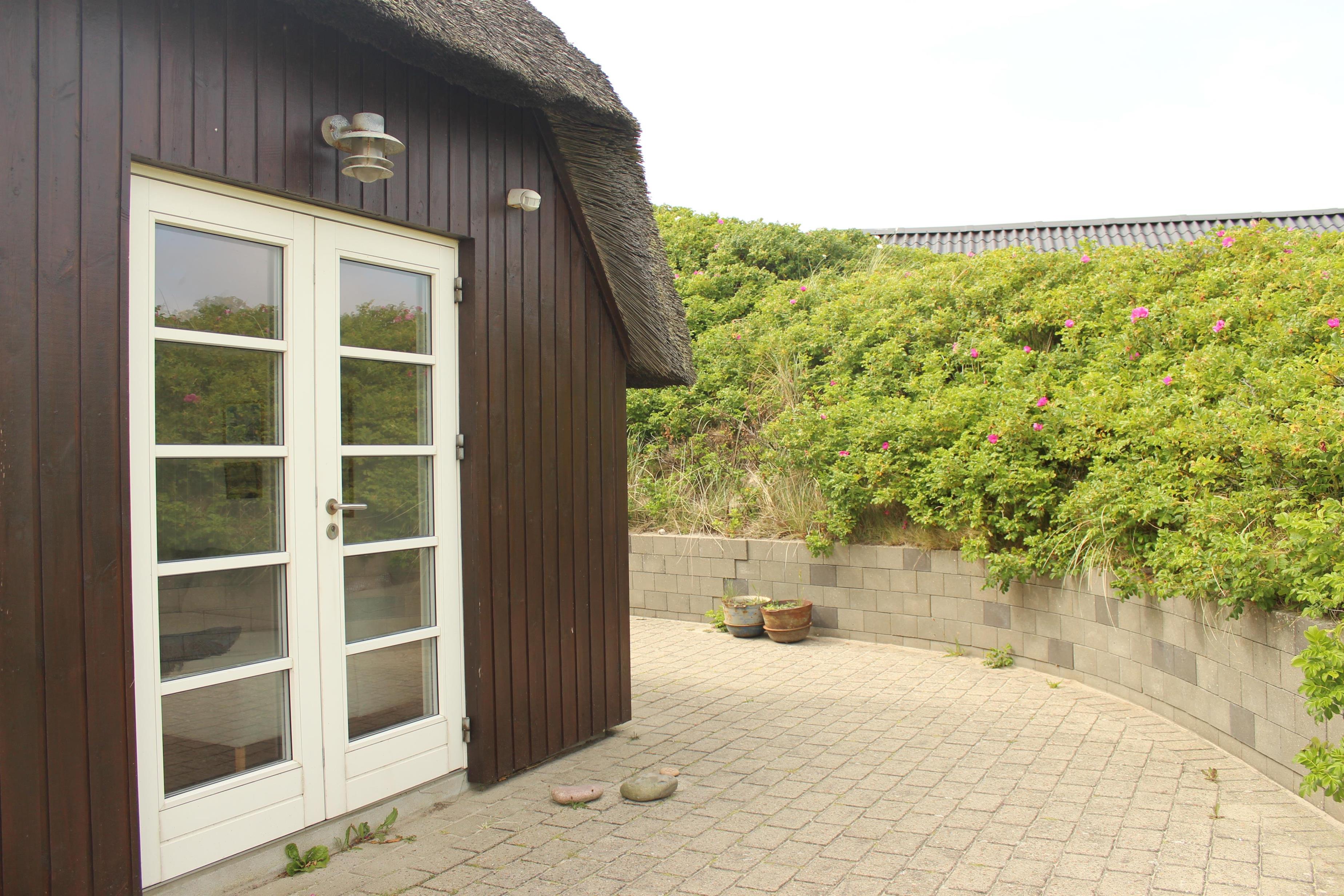 Eine wunderschöne Terrasse fasst das Haus von 3 Seiten ein, sodaß ihr draußen in der Nähe der Nordsee immer einen sonnigen Platz oder schattigen Rückzugsort findet. Von einer kleinen Bank auf einer anliegenden Düne könnt ihr den Sonnenaufgang über den Ringkøbing Fjord beobachten oder den Sonnenuntergang über der Nordsee genießen. Die Düne bietet einen natürlichen Windschutz, ideal für Familien mit kleinen Kindern die somit draußen geschütz spielen können.