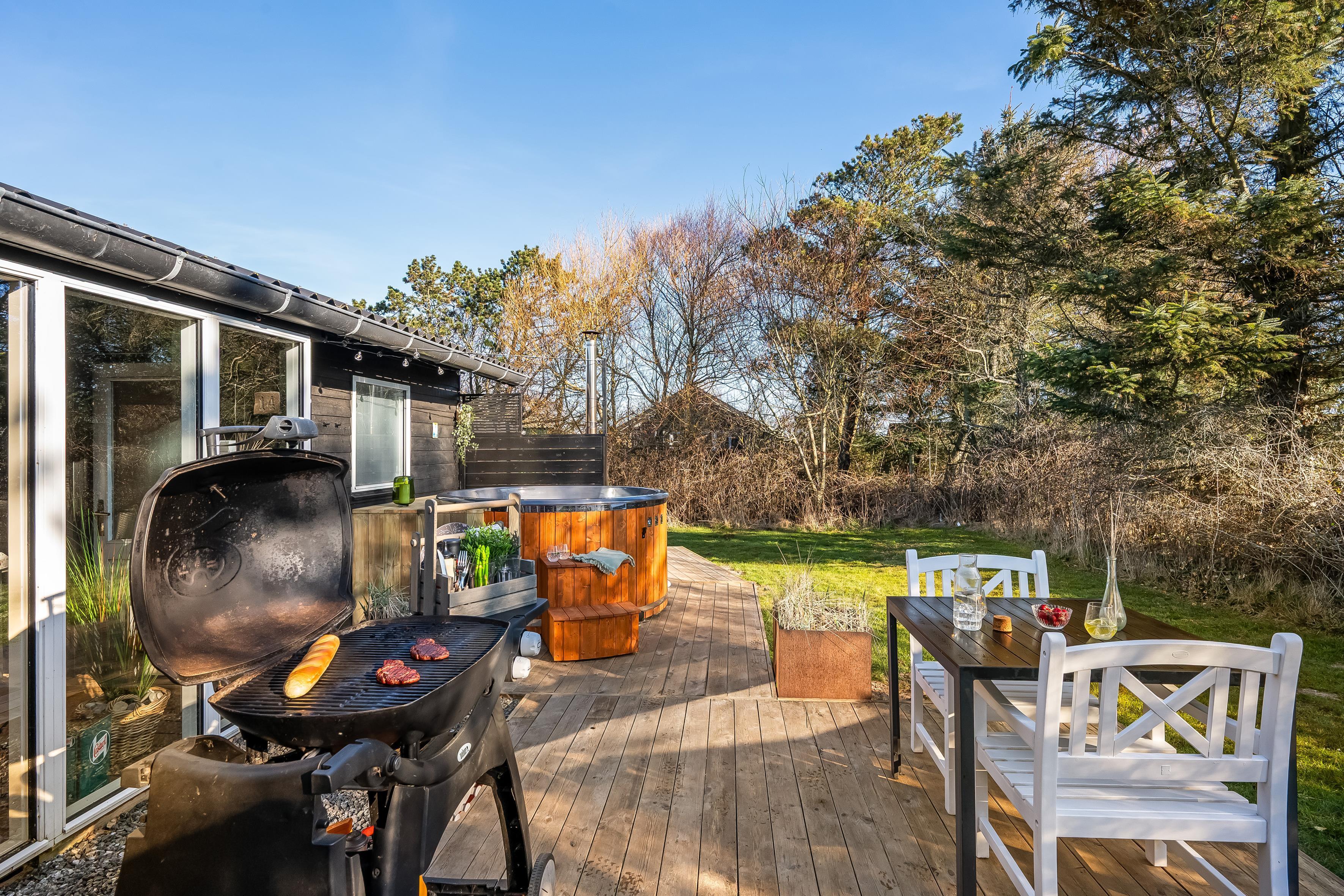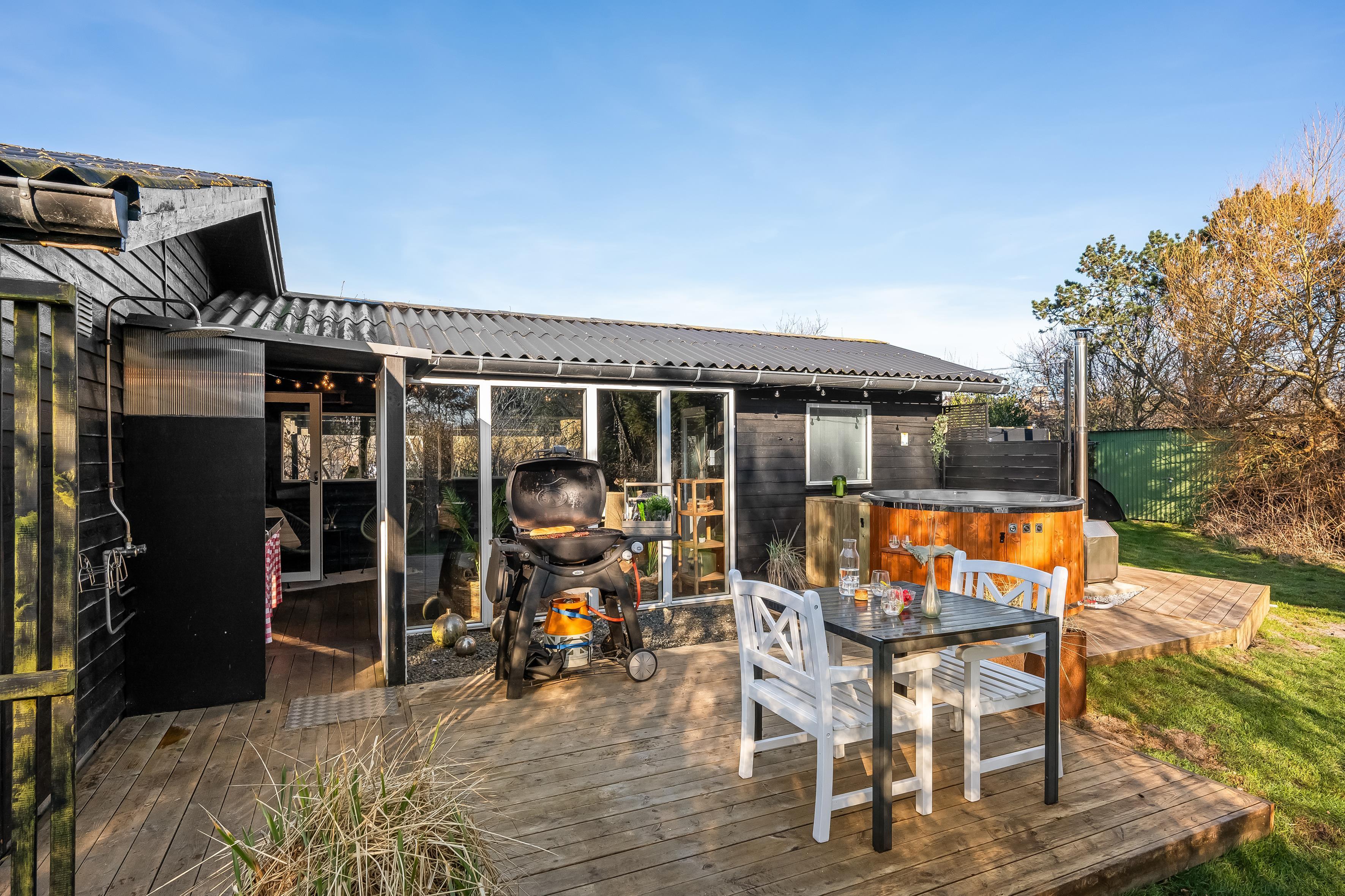 Die Küche ist mit modernen Geräten ausgestattet, darunter Mikrowelle, Backofen, Cerankochfeld, 80-Liter-Kühlschrank und Gefrierschrank. Der Geschirrspüler macht das Aufräumen nach dem Essen zum Kinderspiel. Draußen können Sie die schönen dänischen Sommerabende auf der überdachten Terrasse genießen, wo sich auch ein Grill für gemütliche Grillabende befindet. Die Außendusche eignet sich perfekt, um Sand und Salz nach einem Tag an der nur 600 Meter entfernten Nordsee abzuspülen.
