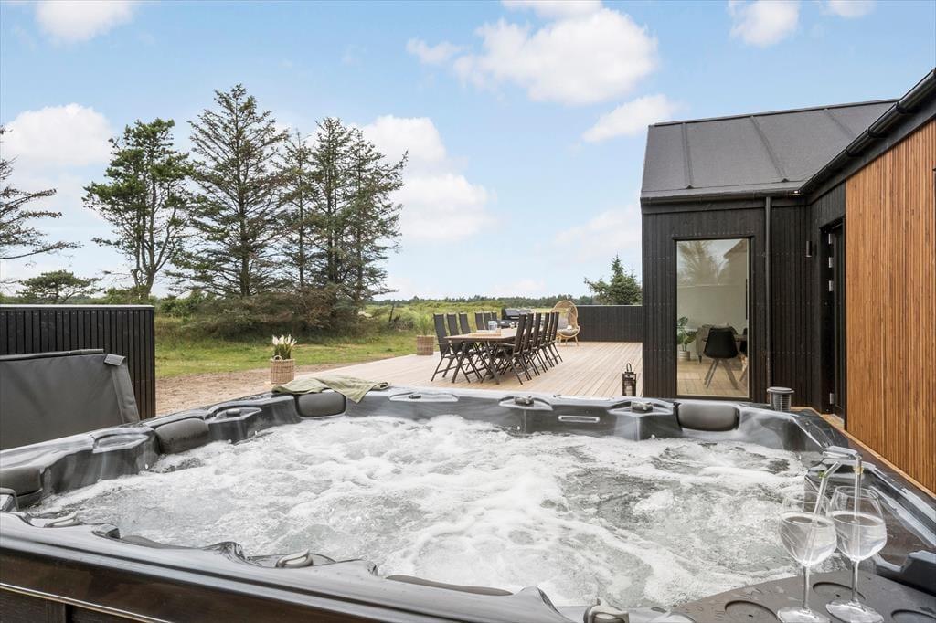 Der großzügige Außenbereich macht deinen Urlaub perfekt – hier kannst du dich entspannen, die Seele baumeln lassen und jeden Moment genießen. Auf der nach Südwesten ausgerichteten Terrasse erwartet dich ein Whirlpool unter freiem Himmel, eine Außensauna sowie eine Dusche im Freien – ideal, um dich nach einem Strandtag schnell zu erfrischen. Die Terrasse bietet sowohl sonnige als auch schattige Plätzchen und gemütliche Lounge-Möbel. Dieses Haus bringt skandinavische Designästhetik und modernen Outdoor-Komfort auf wunderbare Weise zusammen.