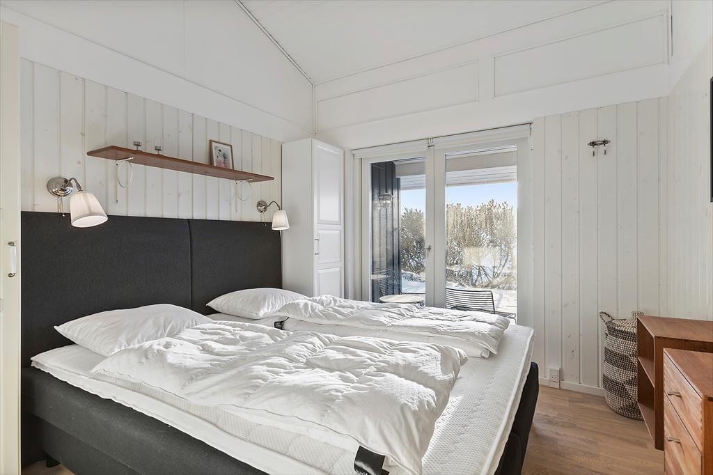Die geschmackvolle Einrichtung, die aufeinander abgestimmten Farbtöne und die großen Fenster tragen maßgeblich zur hellen, leichten Wohnatmosphäre des Hauses bei. Der Aufenthaltsraum, der die Küche und den Wohnraum offen in sich vereint, begeistert mit einem durchströmenden Tageslichteinfall. Die großen Fenster lassen Wohnraum und Dünenlandschaft förmlich miteinander verschmelzen und gewähren während gemütlicher Stunden in den Lehnstühlen einen reizvollen Ausblick in die Natur. An kühlen Tagen sorgt der Kaminofen für Gemütlichkeit und Wärme. An warmen Sommertagen stellen Sie hingegen die Terrassentüren weit auf. Nicht nur der Wohnraum, sondern auch zwei der drei Schlafräume verwöhnen mit Terrassentüren. Das Badezimmer präsentiert sich genauso ansprechend und schön wie die übrigen Räumlichkeiten.