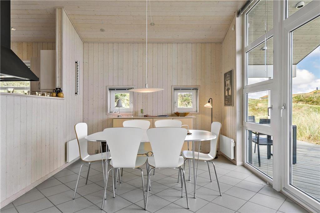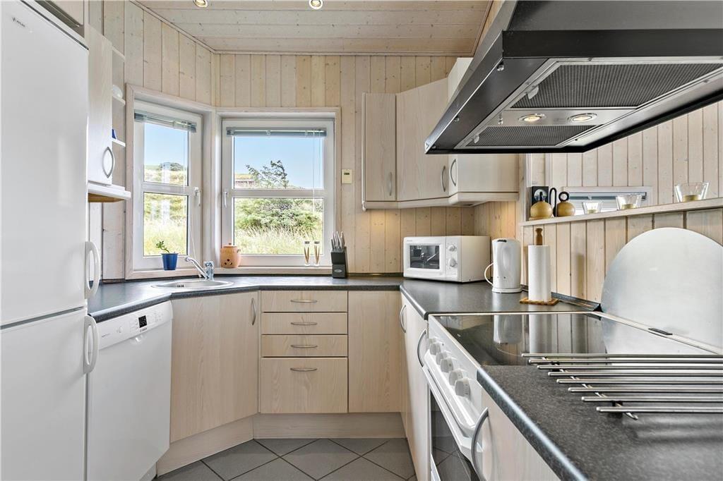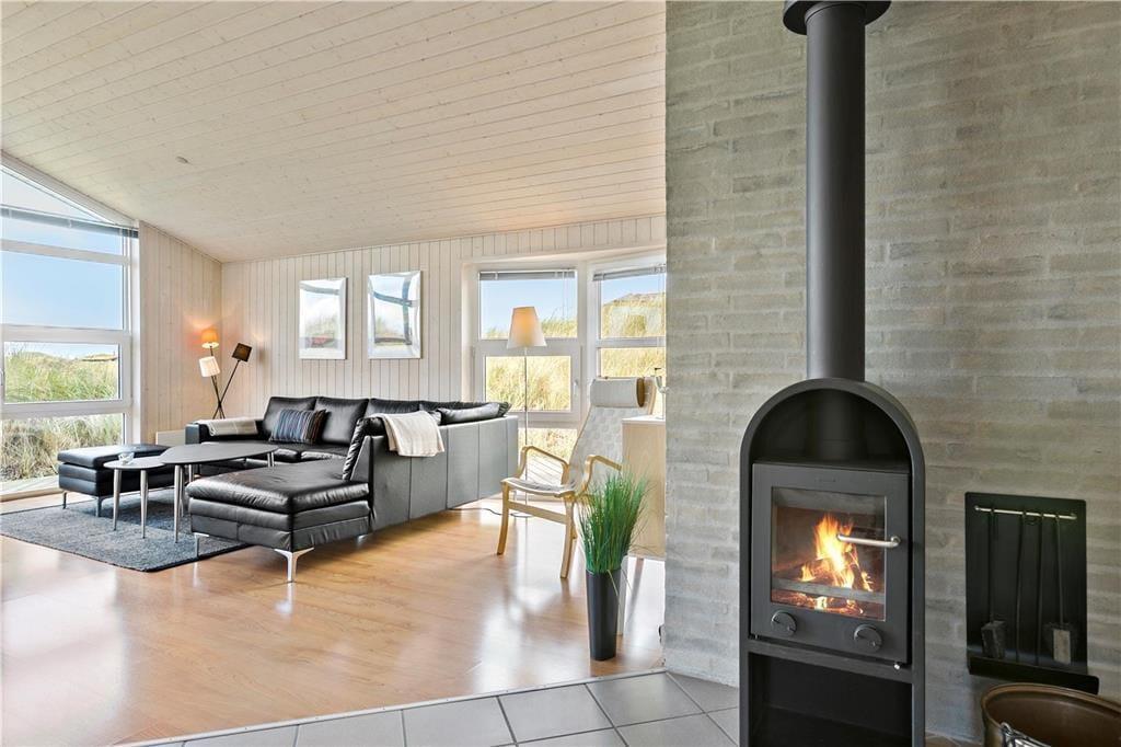 Das Ferienhaus hat alles, wovon Sie bei einem erfolgreichen Familienurlaub träumen. Meerblick von Grundstück, geschmackvolle Einrichtung von hoher Qualität, reichlich Ausstattung und Hilfsmittel, wellnessstimmung in Form von Whirlpool und Sauna und viele weitere, moderne Annehmlichkeiten wie kostenloses WLAN und Parabolantenne mit dänischen und deutschen Sendern. Das Haus ist praktisch aufgeteilt, da sich die Schlafräume und Badezimmer im rechten Bereich vom Eingang befinden und der offene Wohnraum mit Küche und Wohnzimmer sowie Kamin im linken Bereich. Das Haus steht erhöht und durch die Panoramafenster im Wohnzimmer und Essbereich haben Sie eine gute Sicht auf die Dünen und mit der Nordsee im Rückgrund, die nur 500 Meter entfernt ist. Durch sechs Schlafplätze, von denen zwei ein Etagenbett sind, bietet das Haus ideale Bedingungen für eine kleine Familie oder zwei gemeinsamreisende Paare.