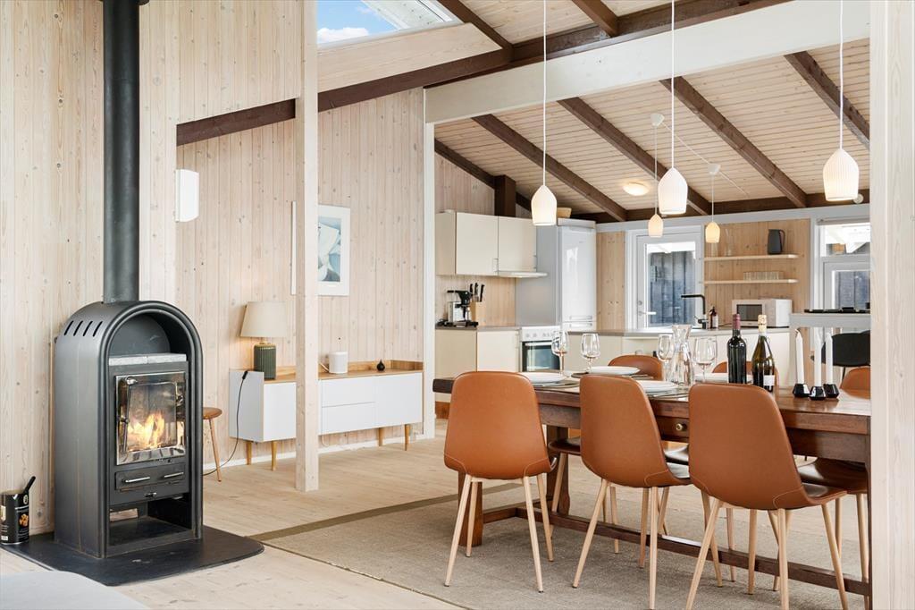 Sobald du das Ferienhaus betrittst, wirst du von einer hellen und einladenden Atmosphäre empfangen. Das große Wohnzimmer mit hohen Decken lädt sowohl zur Entspannung als auch zum Zusammensein ein. Hier kannst du es dir am Kamin gemütlich machen, das Feuer genießen oder einfach auf die wunderschöne Natur des Grundstücks blicken. Das offene Küchen-Esszimmer bietet viel Platz, um Mahlzeiten zuzubereiten und mit Familie oder Freunden gemütliche Stunden zu verbringen. Es ist der perfekte Ort, um gemeinsam zu essen, Gesellschaftsspiele zu spielen oder einfach eine Pause zu machen und die Ruhe zu genießen.