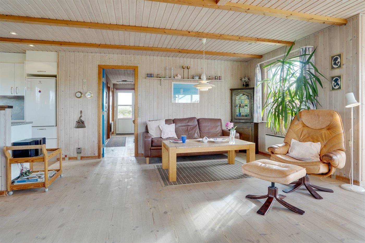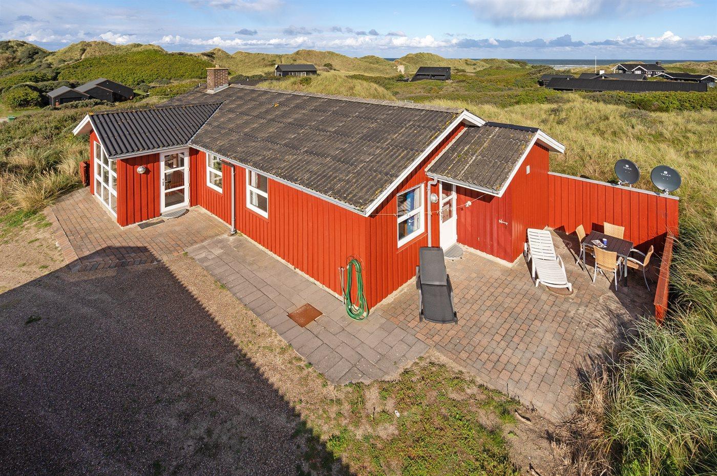 Geräumiges Ferienhaus hoch gelegen auf einem herrlichen Dünengrundstück in großartiger Natur - nur 100 m vom Wasser entfernt. Meeresblick vom Haus und Grundstück. Die guten Terrassen mit Gartenmöbeln sind natürlich von Dünen abgeschirmt.