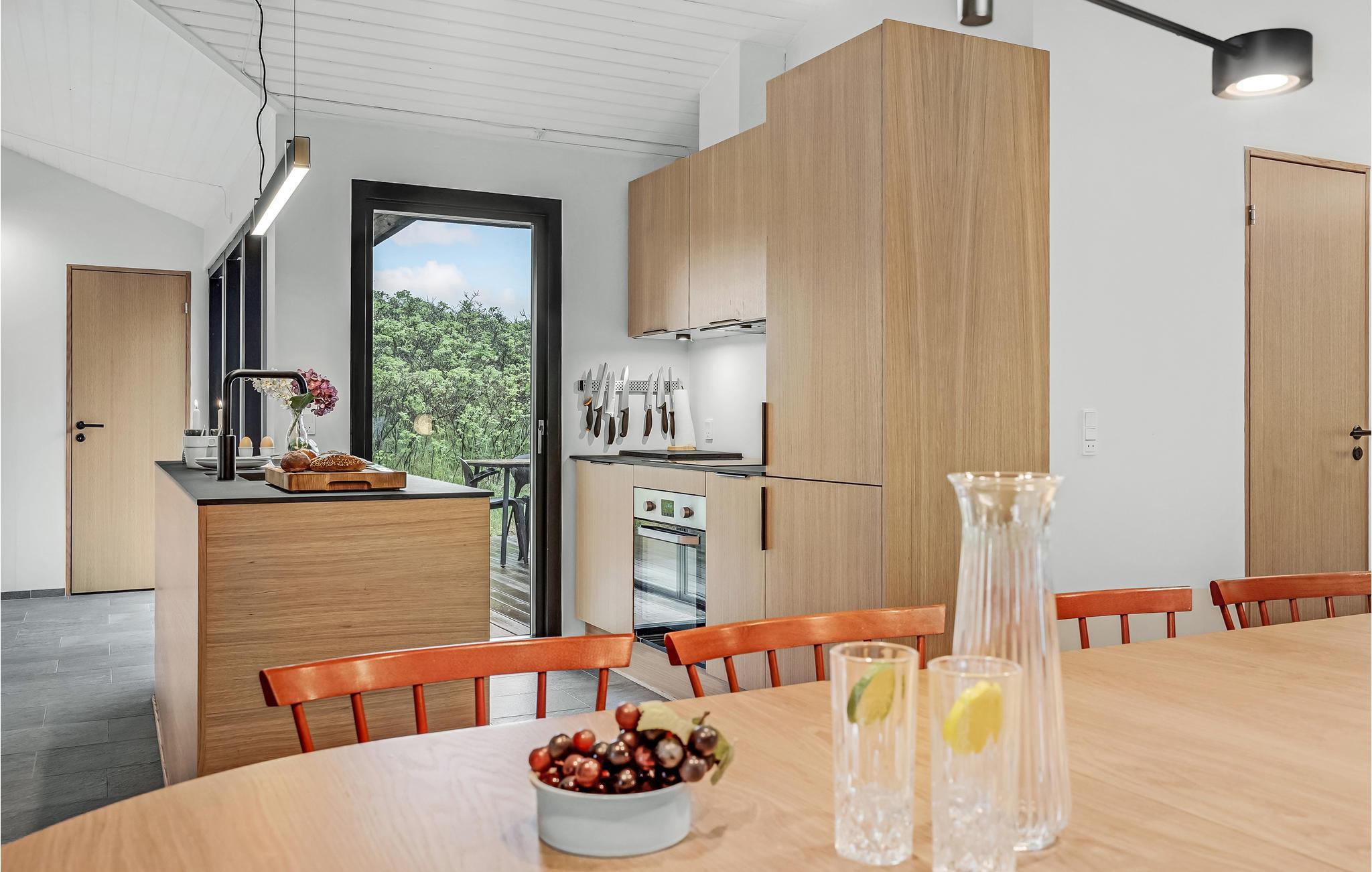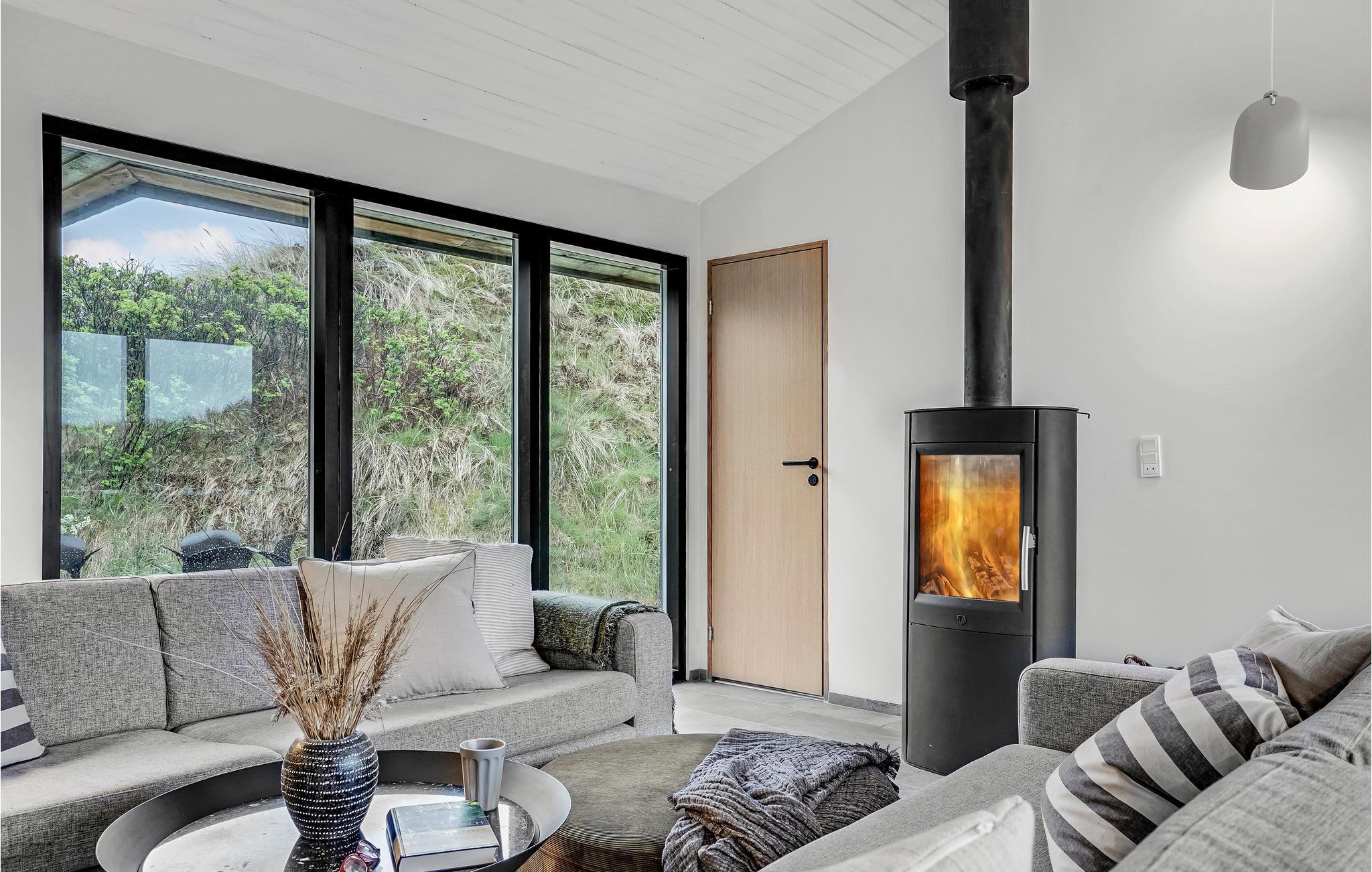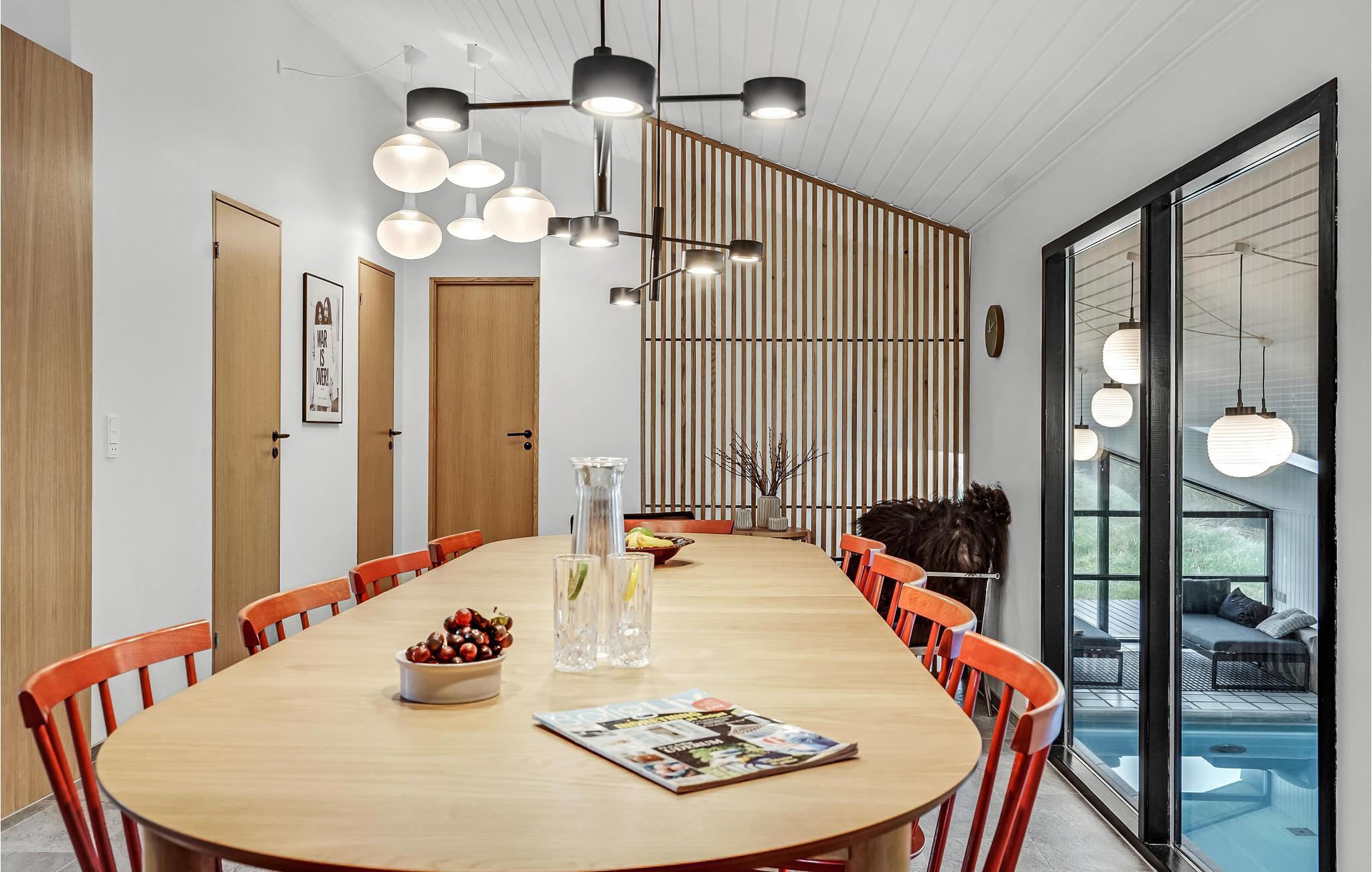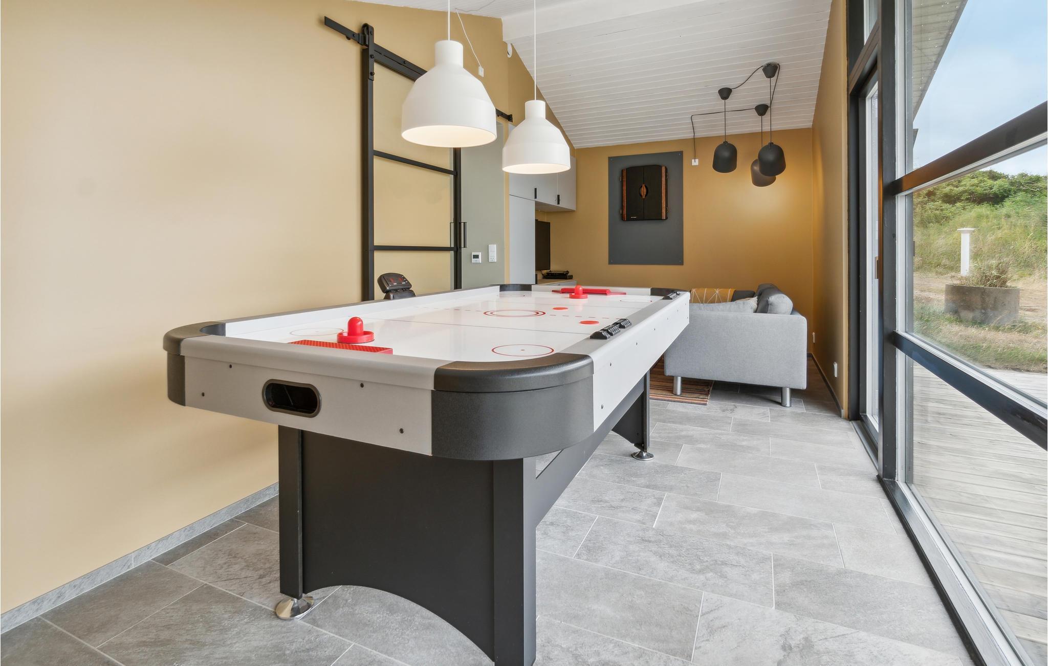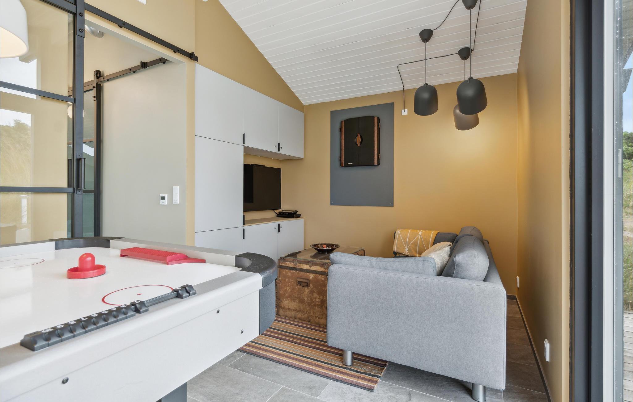 Auf einem Dünengrundstück nur wenige Gehminuten von der Nordsee entfernt und mit einer fantastischen Aussicht auf das Meer und die Dünen von einer Hügelspitze auf dem Grundstück ist dieses Ferienhaus perfekt gelegen. Von Außen gelangen Sie in eine kleine Waschküche und von hier direkt in die helle Poolabteilung mit Whirlpool, Sauna und Baderaum. Über ein paar Stufen gelangen Sie wiederum in das gemütliche, zur kleineren und gut ausgestatteten Küche hin offene Esszimmer. Am Ende des Raumes befindet sich ein gemütlicher Wohnraum mit bequemen Möbeln. Das Haus verfügt über ein offenes Gebälk und Klinkerböden mit Fußbodenheizung.