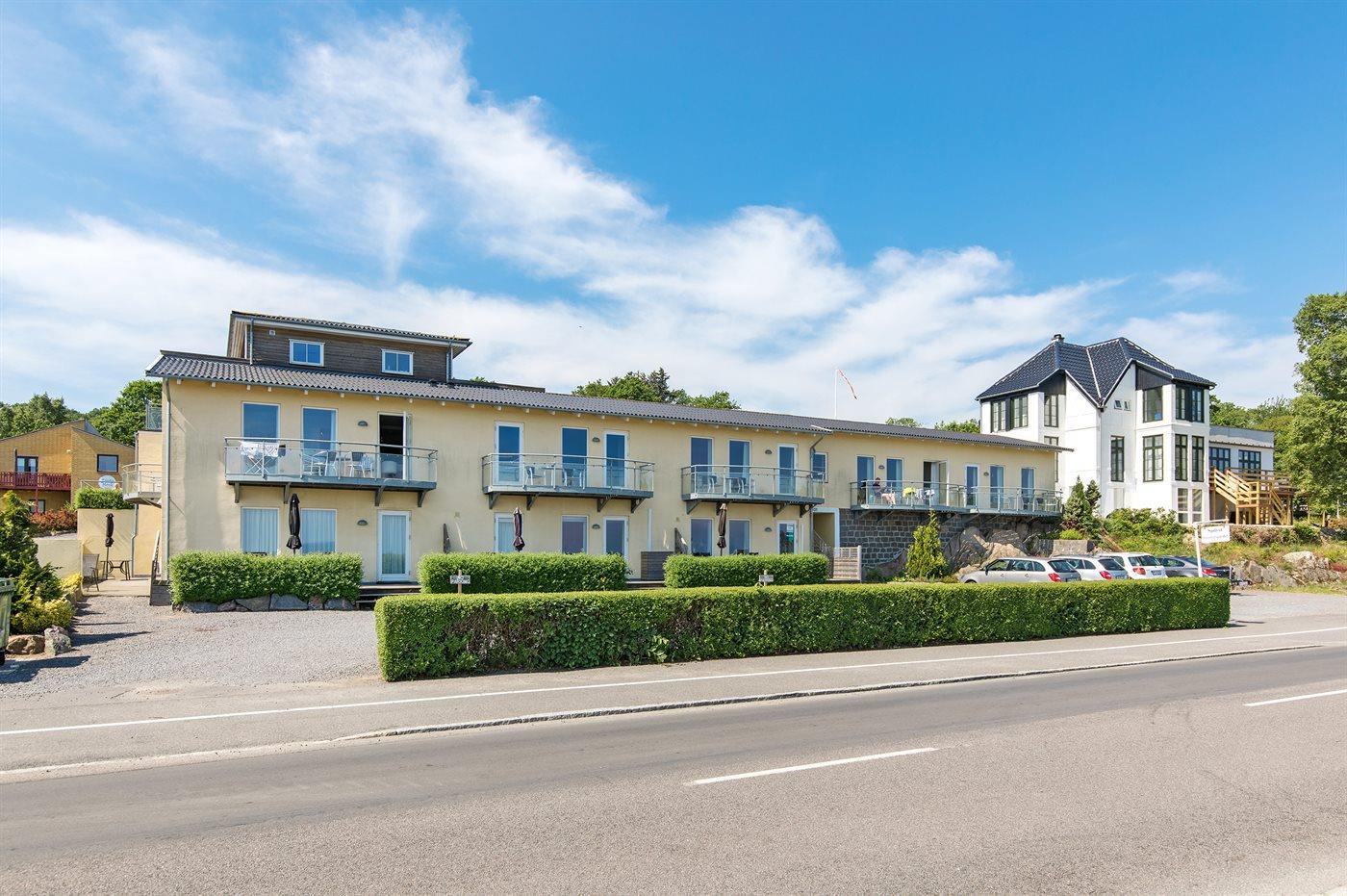 Im kleinen Ferienzentrum Sjølyst gibt es eine große, hochgelegene Gemeinschaftsterrasse auf dem hügeligen Gelände, das das spannende Gebiet von Sandkås prägt. Es liegt in der Nähe von Allinge, der „Folkemøde-Stadt“, die in Woche 24 jedes Jahr die bedeutendsten Politiker des Landes und zahlreiche Unternehmen zu lebhaften Tagen in der kleinen Hafenstadt versammelt, die in dieser Zeit kaum wiederzuerkennen ist.