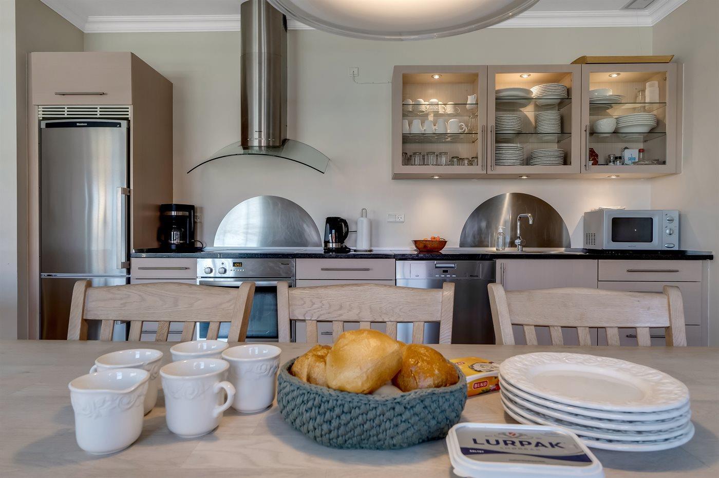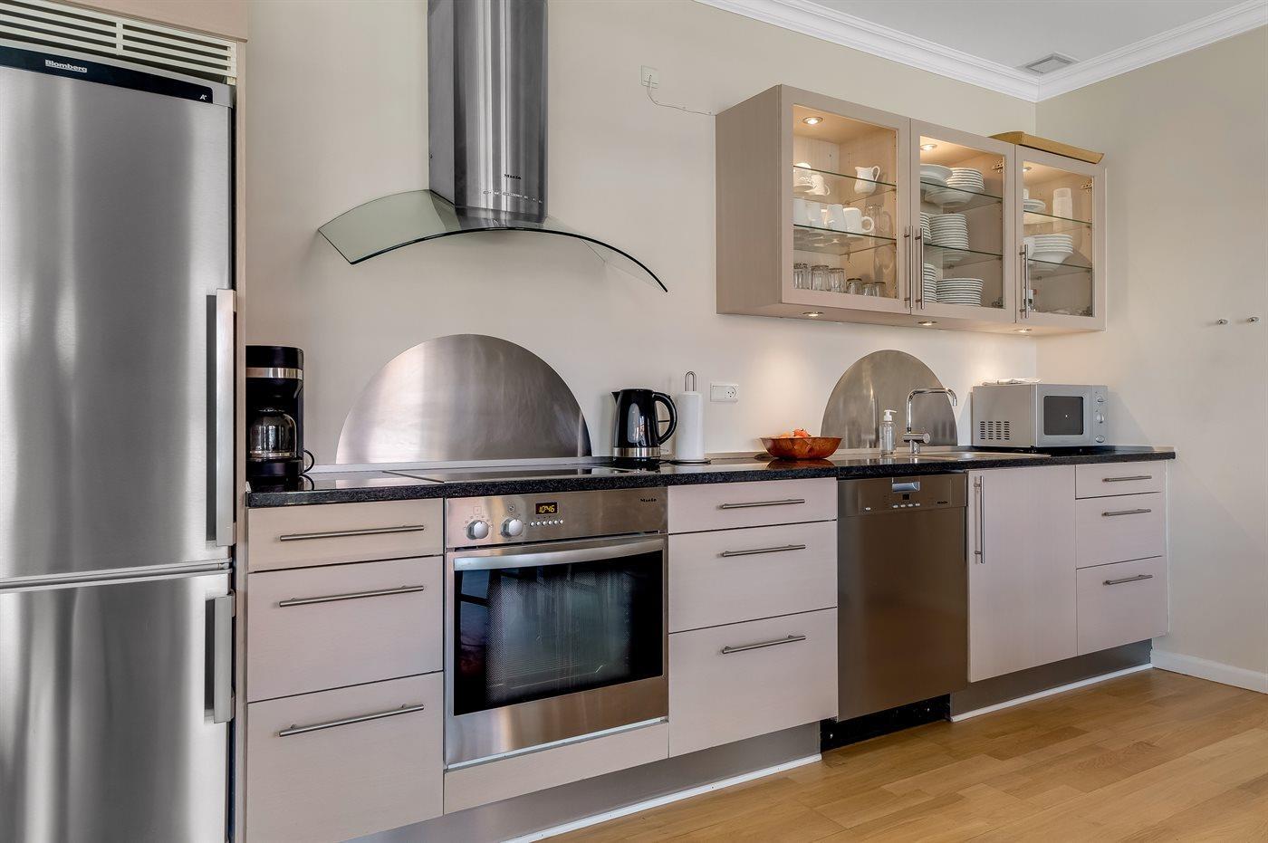 Die Küche ist mit Kühlschrank ausgestattet. Außerdem gibt es 4 Keramik-Kochfelder, Umluftofen, Mikrowelle sowie Geschirrspüler. Fußbodenheizung in der Küche.