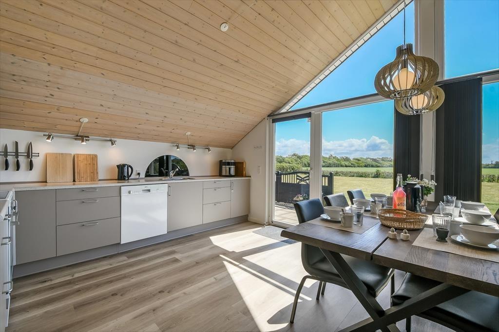 Dank der großen Giebelfenster, die einen tollen Tageslichteinfall bedingen, verschmelzen das Hausinnere und die umliegende Landschaft förmlich miteinander. Der Esstisch ist direkt am Fenster platziert. In der offenen Küche genießt du selbst bei der Zubereitung der Mahlzeiten die Sonnenstrahlen und die Nähe deiner Lieben im Wohnraum. An kühlen Tagen sorgt ein Kaminofen für behagliche Wärme und ein Maximum an Stimmung. Pure Entspannung verspricht der im Badezimmer untergebrachte Whirlpool. Nachts kannst du dich mit deiner Familie in drei guten Schlafräumen bestens ausschlafen.