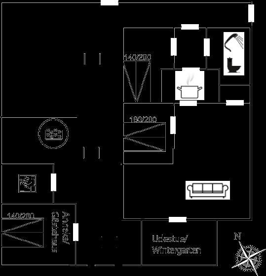 Im Inneren gibt es Holzböden im Wohnzimmer und in der Küche. Im restlichen Haus gibt es Teppichböden – jedoch vinyl im Flur. Das Ferienhaus verfügt über ein gutes Badezimmer mit Fußbodenheizung, Duschnische und Waschmaschine. Nette, kleine Küche mit u. a. Geschirrspüler und Tiefkühlgerät. Gemütliches Wohnzimmer mit Kaminofen, Kabel-TV, digitalem Satellitenanschluss und Stereoanlage mit CD-Spieler. Vom Wohnzimmer direkter Ausgang zu schönem Wintergarten. Außerdem kostenlose ADSL-Internetverbindung vorh. (Computer ist mitzubringen). 2 Schlafzimmer, beide mit Doppelbett. Außerdem Gästehaus mit Doppelbett. Für die kleinen Feriengäste stehen Kinderbett und Kinderhochstuhl zur Verfügung.