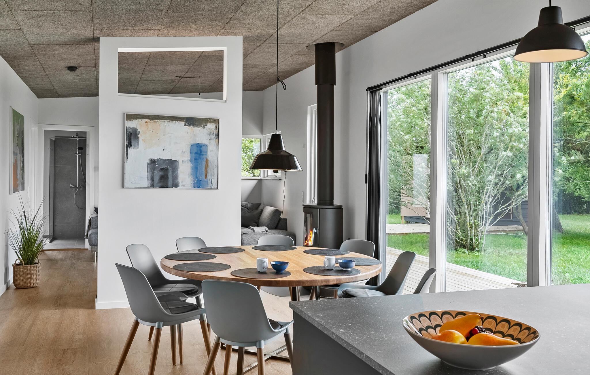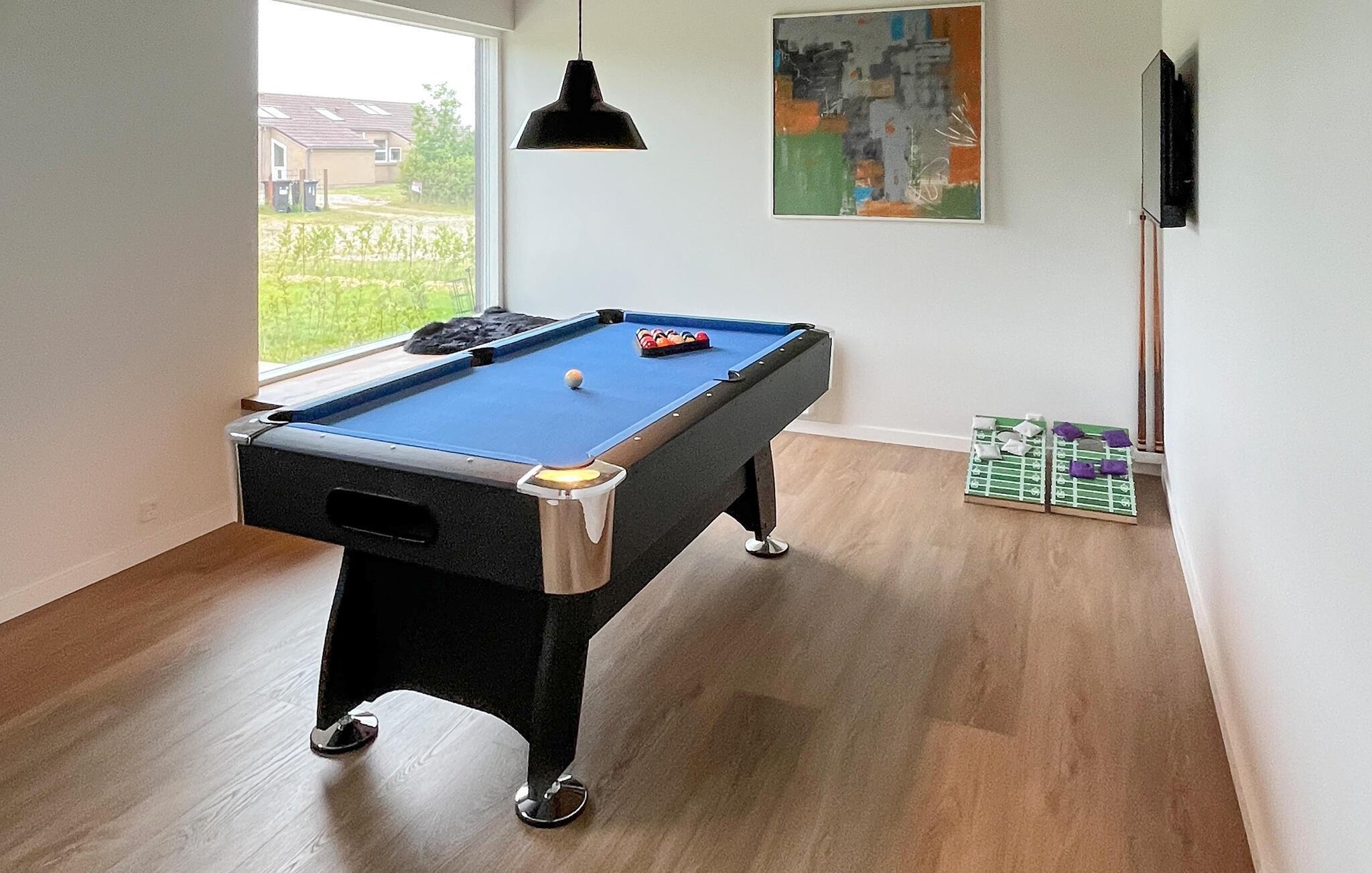 In diesem komfortablen Haus schaffen bodentiefe Fenster, eine warme Holzoptik und stilvolle Möbel eine ideale Atmosphäre, um zur Ruhe zu kommen und neue Energie zu tanken. Entspannen Sie sich bei einem Film- oder Spieleabend, messen Sie Ihre Geschicklichkeit beim Billard oder kochen Sie gemeinsam in der modernen Küche leckere Mahlzeiten für sich und Ihre Mitreisenden.