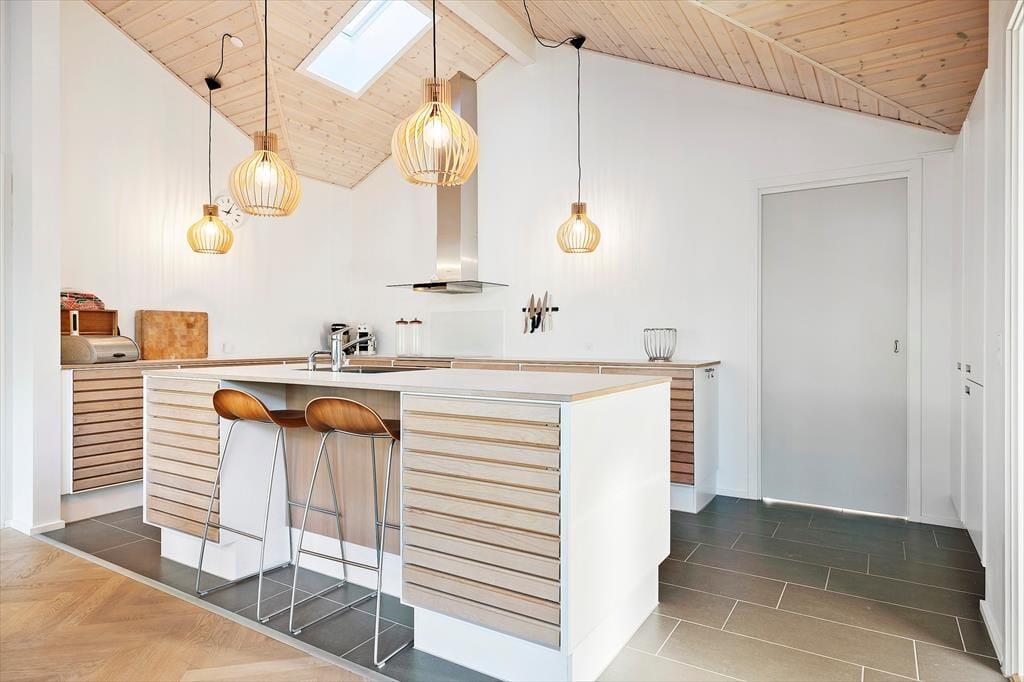 Bei diesem 158 m² großen Ferienhaus aus dem Jahr 2017 war sich der Eigentümer bereits während der Bauphase der richtig schönen Natur ringsum bewusst. Das Haus ist daher so platziert, dass Sie sich im Hausinneren an einem Ausblick auf die schönen, sanft wiegenden Nadelbäume des Grundstücks und auf die friedvolle Landschaft erfreuen können. Der Wohnraum glänzt mit einer riesigen Fensterpartie, die Ihnen wunderbare Aussichten ermöglicht - sei es, wenn Sie in gemütlicher Runde auf dem Sofa Platz nehmen oder ein gutes Essen im Kreise Ihrer Lieben rund um den Esstisch genießen. Für ein Maximum an Stimmung und Behaglichkeit sorgt derweil der romantisch knisternde Kaminofen. Die gut ausgestattete Küche ist offen mit dem Wohnraum verbunden. Auf der anderen Seite des Eingangsbereichs gibt es einen weiteren Aufenthaltsraum, bei dem es sich um einen Aktivitätsraum mit einem Tischkicker und einer Leiter hinauf auf den Schlafboden handelt. Die insgesamt vier Schlafräume, die Platz für insgesamt bis zu sieben Personen bieten, sind angenehm im Haus verteilt. Erwähnen möchten wir, dass eines dieser Schlafzimmer über ein eigenes Badezimmer verfügt, in dem ein toller Whirlpool zu traumhaft erholsamen und entspannten Momenten voller Wellnessflair einlädt.