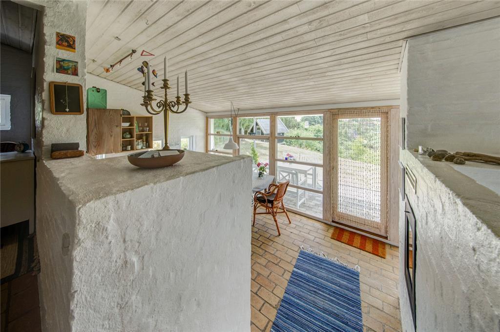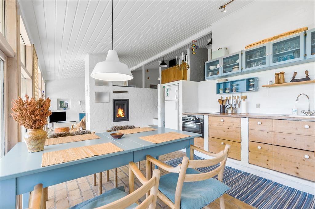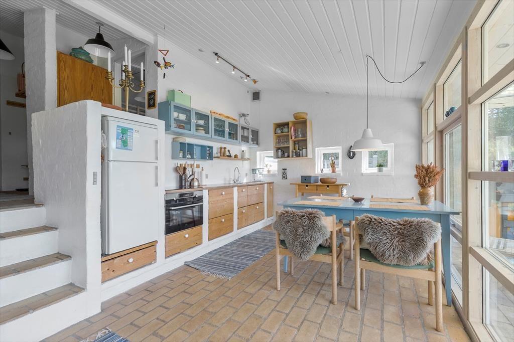 Nahe der Spitze der Halbinsel Helgenæs erwartet Sie dieses gemütliche, von einem Architekten entworfene Ferienhaus mit zwei Etagen. Das Haus bietet ausreichend Platz für 6 Personen und einen Hund. Die Inneneinrichtung kann als geschmackvoll und interessant charakterisiert werden. Das Urlaubsdomizil begrüßt Sie mit einer ansprechenden Küchenabteilung und einem gemütlichen Wohnraum, in dem man den Panoramaausblick über die idyllische Natur ringsum und das Meer in vollen Zügen genießen kann. In die Mauer, die die Küche vom Wohnraum aus trennt, ist ein zu beiden Seiten offener Kaminofen eingebaut, der Sie in Küche und Wohnraum mit seinem romantischen Knistern und seiner behaglichen Wärme verwöhnt. Vom Wohnraum aus haben Sie zudem direkten Zugang zur großen Terrasse. In der oberen Etage ist ein schönes Badezimmer mit einer Duschnische platziert. Gleiches gilt auch für die Schlafplätze, die sich bei diesem Haus auf 2 Schlafzimmer mit je einem Doppelbett verteilen. Ein weiteres Doppelbett ist im gemütlichen Nebengebäude untergebracht. Eine Internetverbindung ist vorhanden.