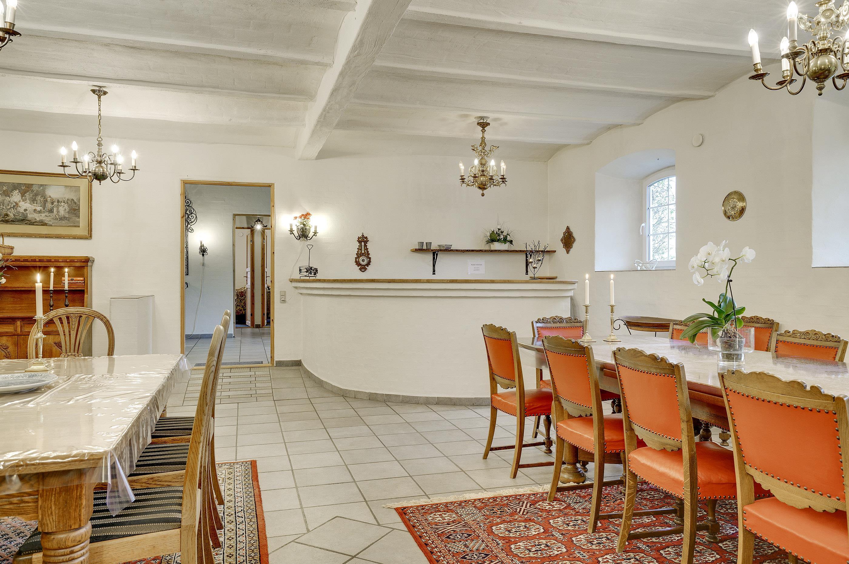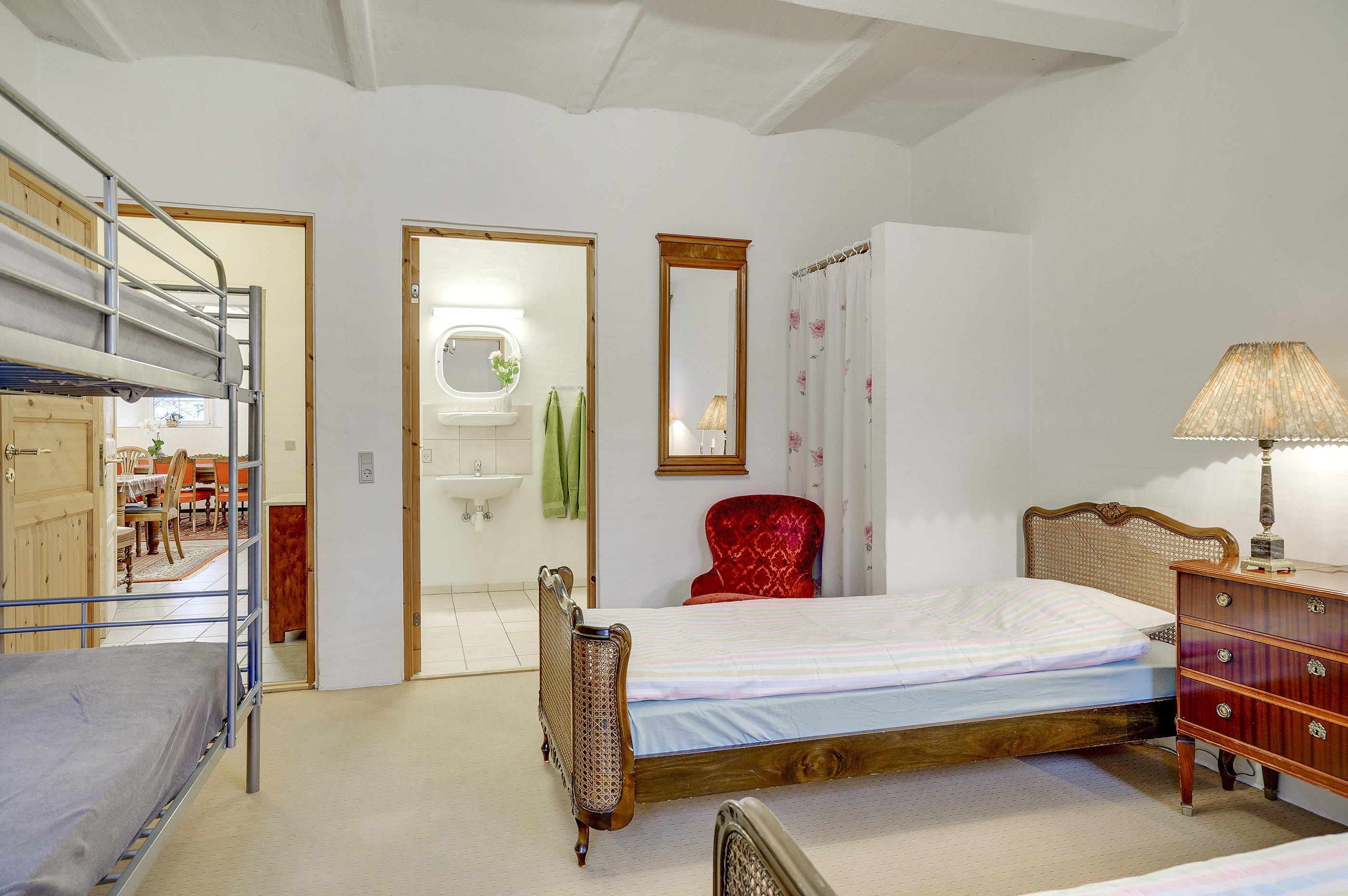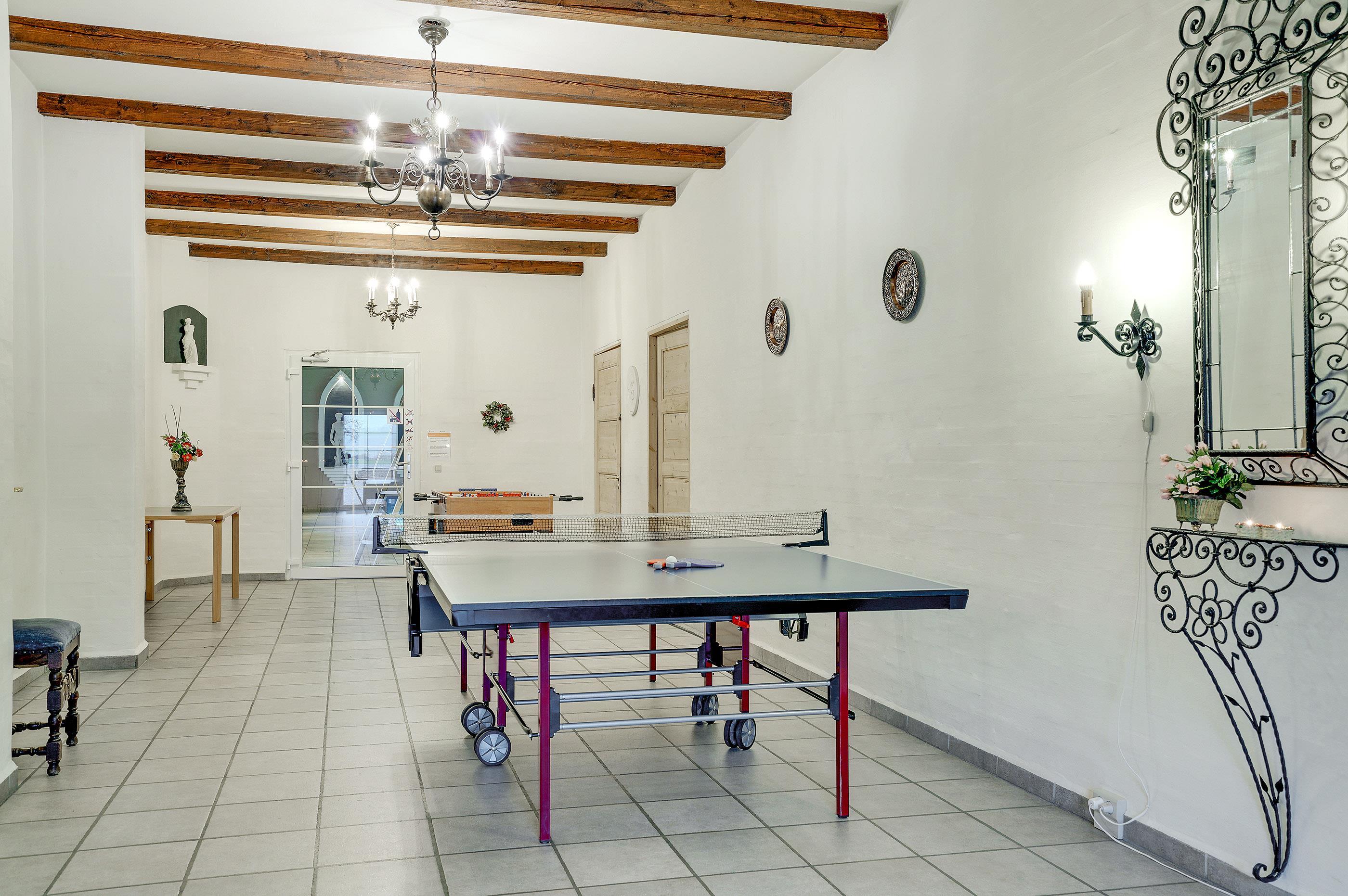 Das Anwesen überzeugt zudem mit 10 Badezimmern inklusive Duschnische und Fußbodenheizung sowie zwei Gäste-WCs. Die vorhandenen Schlafplätze verteilen sich auf insgesamt 12 Schlafräume. Ihnen stehen 24 Schlafplätze in Form von Doppelbetten und 6 Schlafplätze in Etagenbetten zur Verfügung. Ein Nebengebäude beherbergt darüber hinaus 5 Schlafräume mit insgesamt 10 zusätzlichen Schlafgelegenheiten, die für einzelne Nächte gebucht werden können, einen Festsaal und eine Ballsporthalle. Bitte beachten Sie aber, dass das Haus nicht an Gäste mit Kindern unter 16 Jahren vermietet wird.