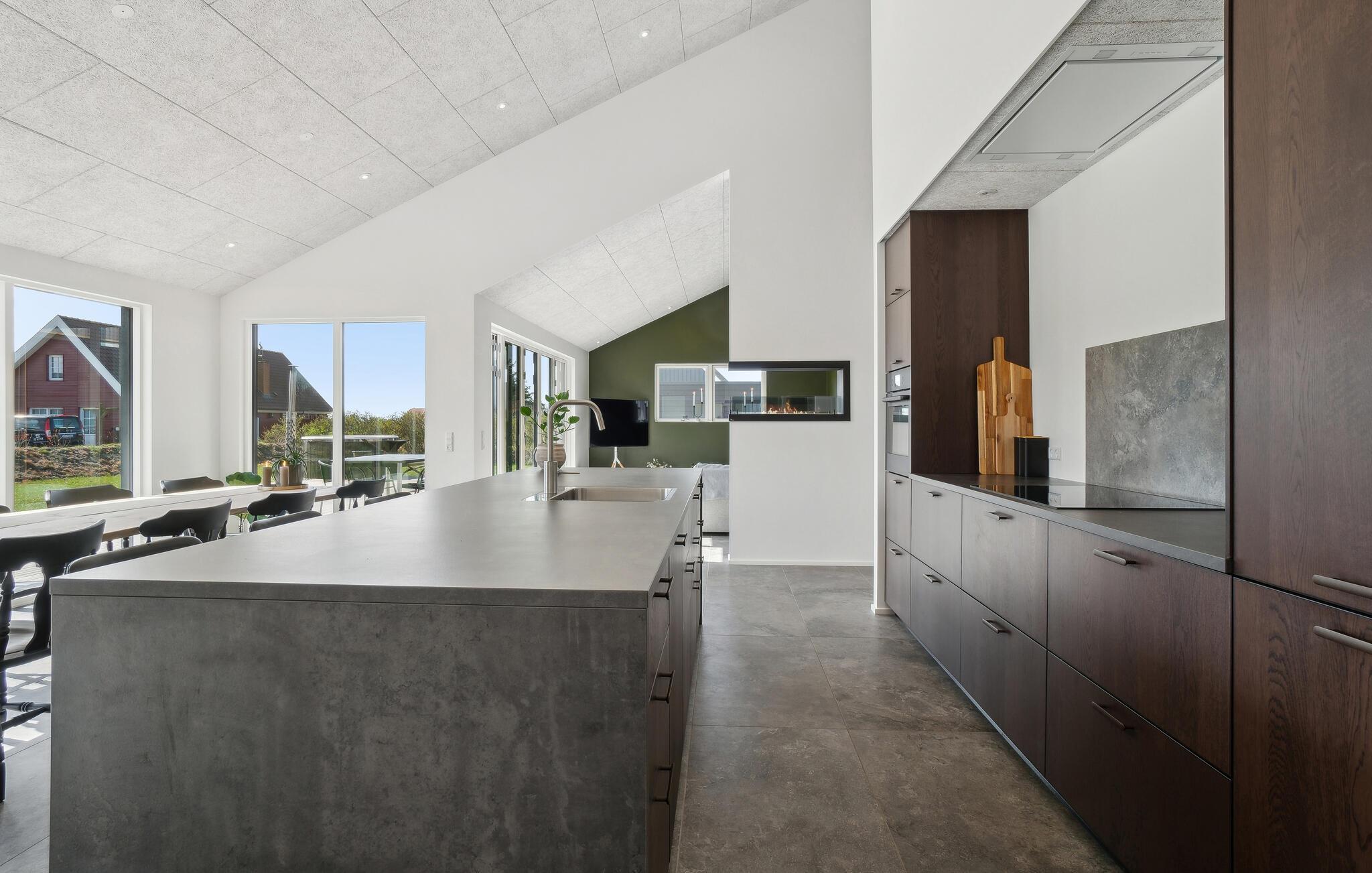Erleben Sie einen ruhigen und angenehmen Urlaub in diesem gepflegten Ferienhaus. Genießen Sie die entspannte Atmosphäre im offenen Wohnbereich, der viel Platz für gemeinsames Kochen, Spielen und Ausruhen bietet. Bereiten Sie in der eleganten, offenen Küche Ihre Lieblingsgerichte zu und lassen Sie sich die Mahlzeiten mit dem schönen Blick nach draußen schmecken. Abends sorgt der Kaminofen für wohlige Wärme, ideal für gesellige Kartenspielrunden und anregende Gespräche.