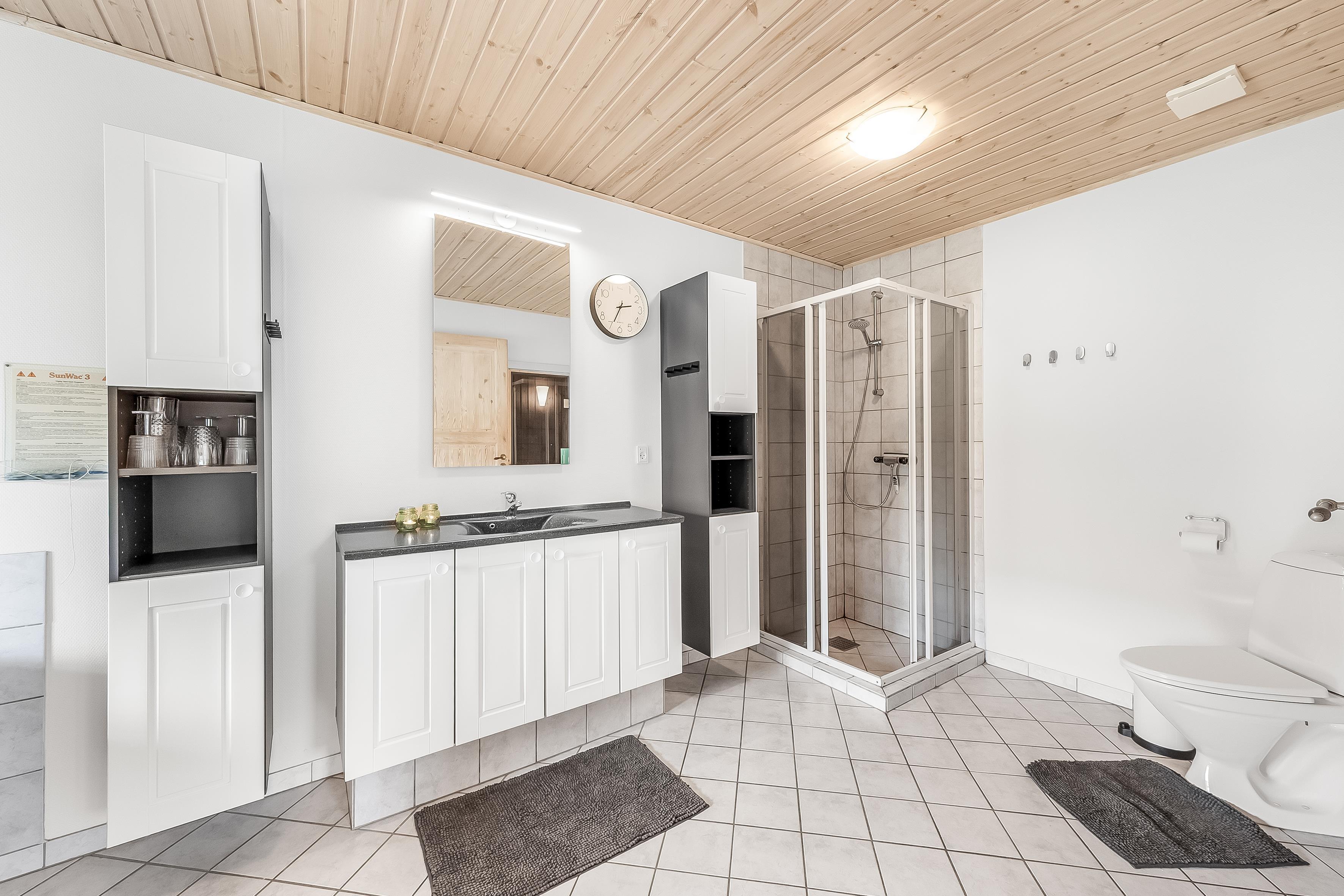 Zwei Badezimmer, beide mit Dusche und Fußbodenheizung ausgestattet, sorgen für ein komfortables Erlebnis. Mit zwei Toiletten gibt es ausreichend Platz für alle, damit sich alle ohne Wartezeiten verwöhnen lassen können.