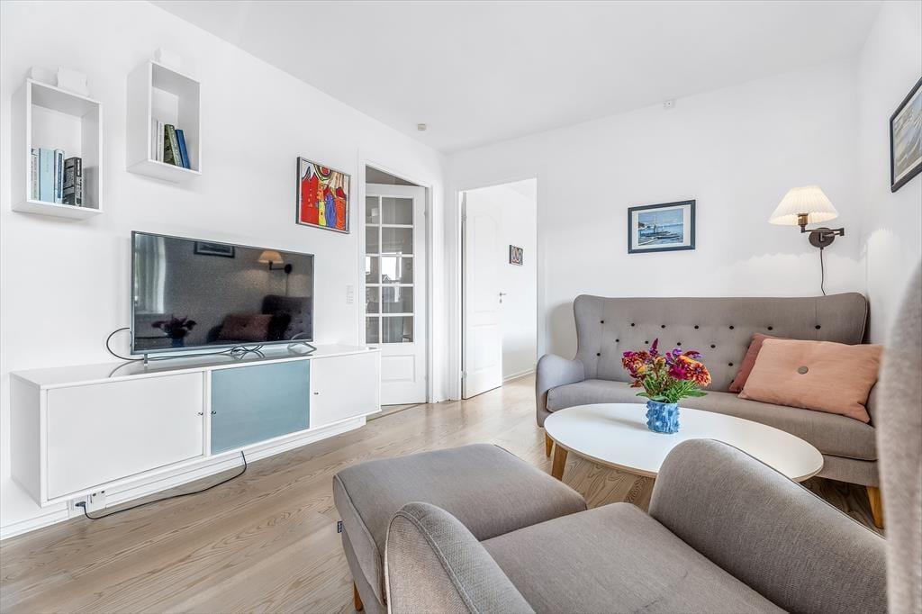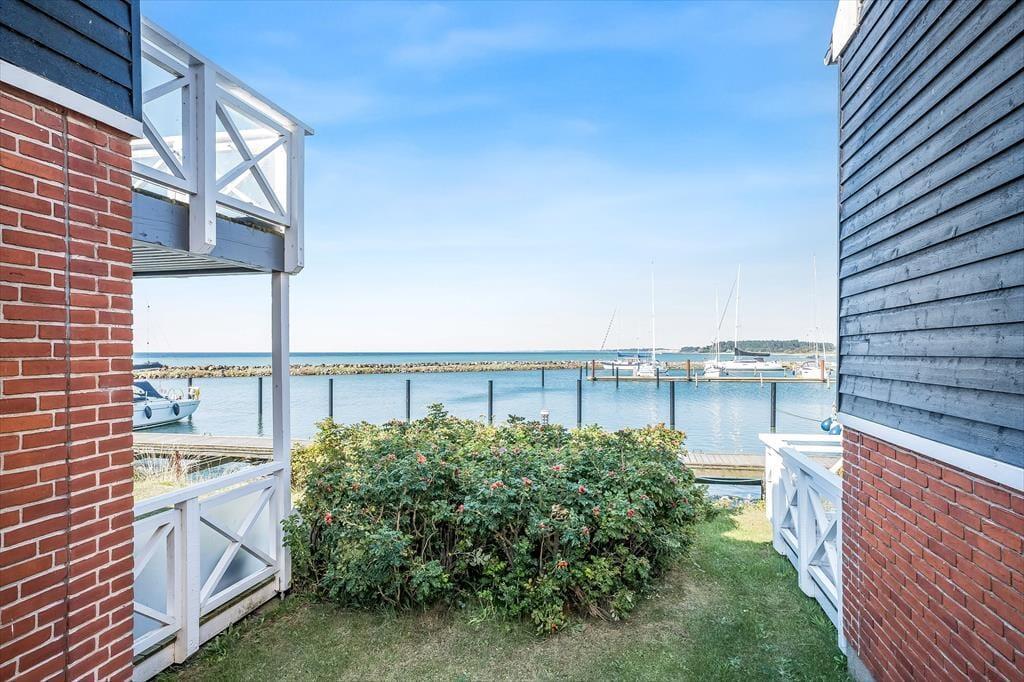 Die Wohnung verfügt über eine schöne, teilweise überdachte Terrasse mit Zugang vom Wohnzimmer. Hier finden Sie Gartenmöbel, auf denen Sie Ihre Mahlzeiten und die warmen Abende genießen können. Direkt vor der Wohnungstür befindet sich eine kleine geflieste Terrasse mit Tisch und Bänken, sodass Sie wählen können, ob Sie in der Sonne oder im Schatten sitzen möchten. Von der Wohnung aus haben Sie einen wunderschönen Blick auf den Yachthafen und sind nah am Strand. Dank der günstigen Lage können Sie auf der einen Seite der Wohnung frischen Fisch kaufen und auf der anderen Seite Ihren Fisch auf der Terrasse genießen.