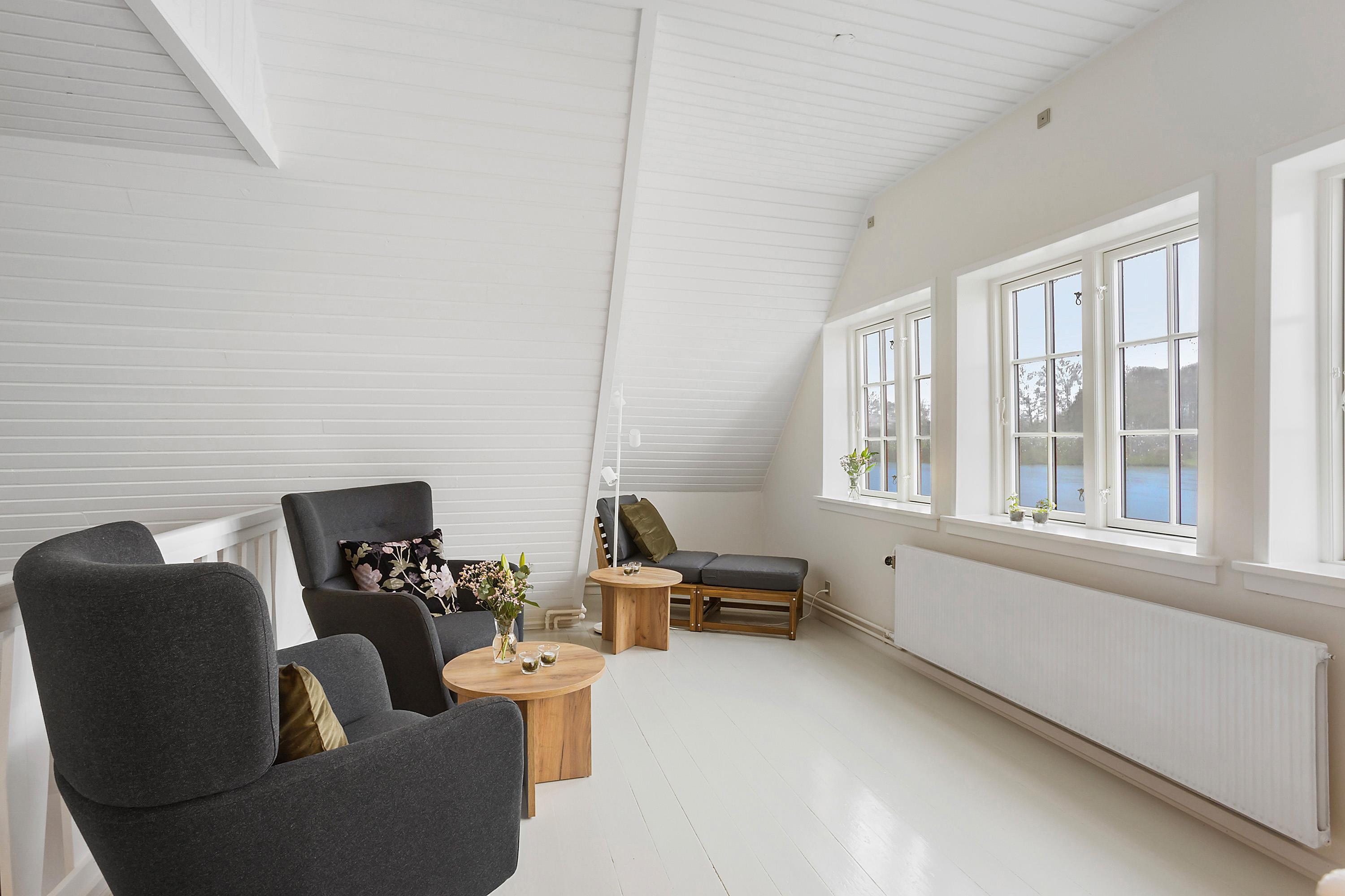 Das Haus besteht aus einer Eingangshalle, einer großen Küche mit Esszimmer und einem großen, charmanten Wohnzimmer mit sichtbaren Balken. Von hier gelangst du über eine offene Treppe in die Lounge-Ecke im ersten Stock mit Aussicht auf den Hvidkilde-See und in die TV-Hygge-Ecke, die ganz besonders von den jüngeren Familienmitgliedern genutzt wird. Zwei Toiletten sind direkt vom Wohnzimmer zu begehen.