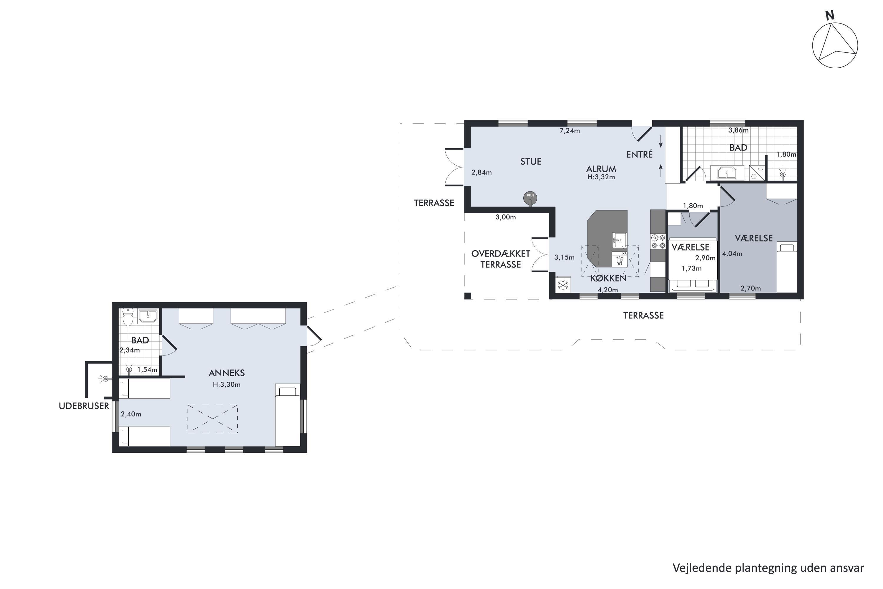 Die Schlafplätze des Ferienhauses verteilen sich auf zwei Schlafzimmer – eines mit Doppelbett und eines mit Etagenbett. Weitere drei Schlafplätze befinden sich im großzügigen, geschmackvoll eingerichteten Annex, der zudem über ein eigenes Badezimmer verfügt. Das Ferienhaus liegt auf einem schönen Grundstück mit großer Rasenfläche, ideal für Spiel und Aktivitäten im Freien. Außerdem gibt es eine Feuerstelle und ein Trampolin.