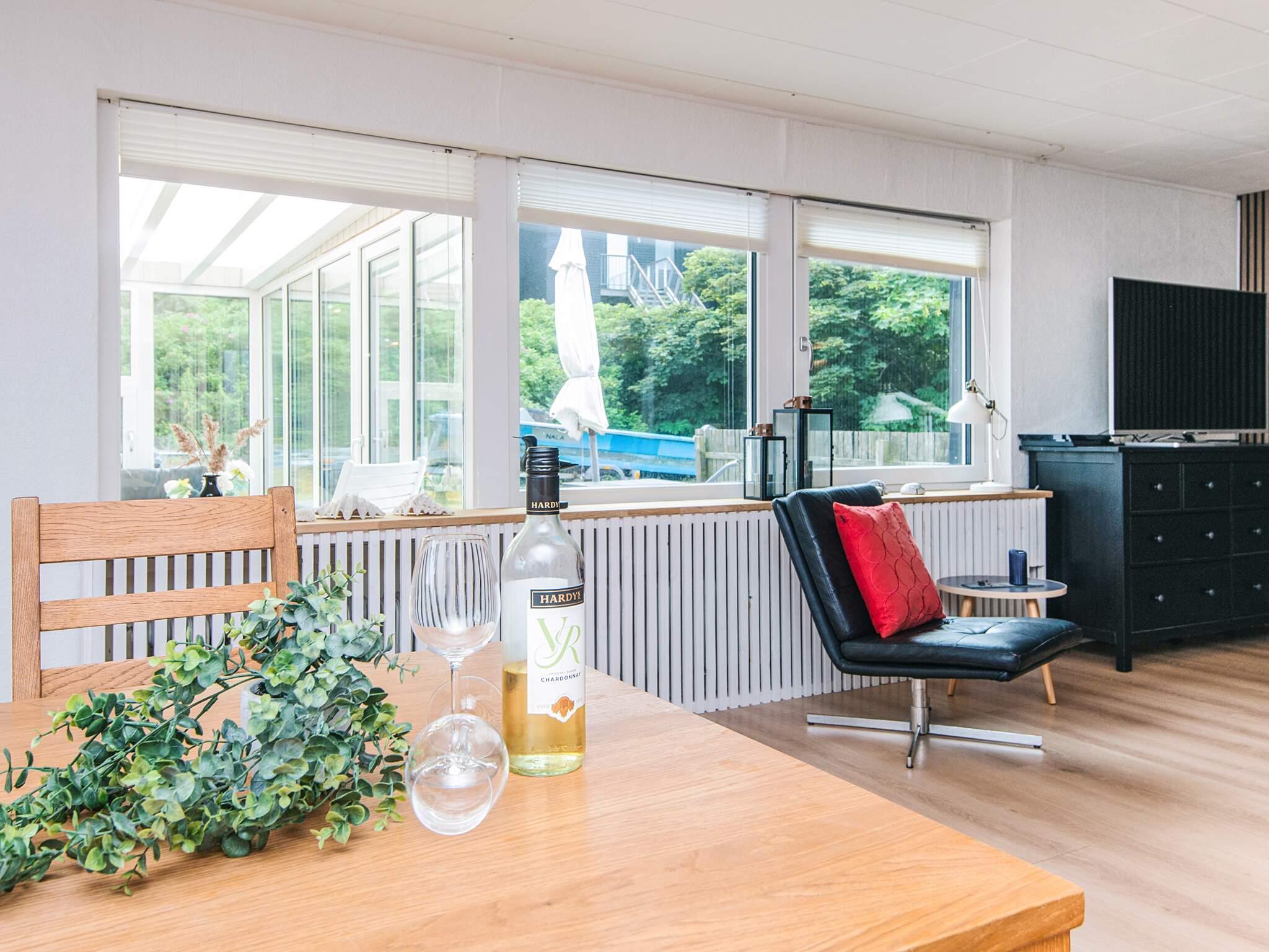 Das Ferienhaus hat ein gut ausgestattetes Wohn- und Esszimmer mit einem großen Fernseher sowie Zugang zu einer 25 m2 großen, verglasten Veranda mit Ausblick zum Grundstück. Dort kann man z.B. an windigeren Tagen auf der gemütlichen Couch Platz nehmen und den Ausblick genießen. Gut ausgestattete, separate Küche im Haus mit Essecke.