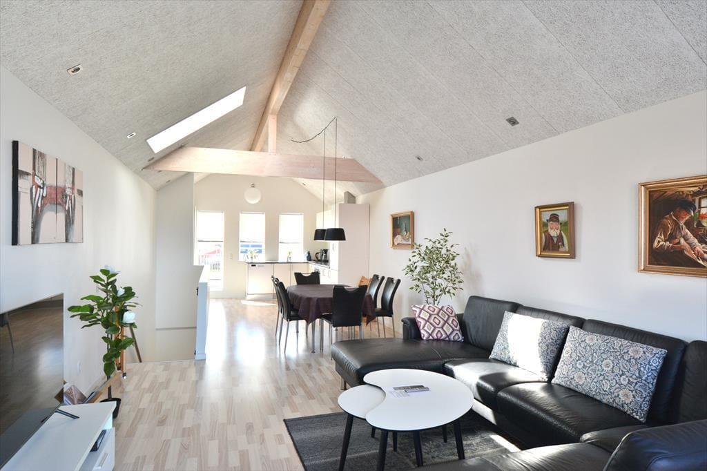 Treten Sie ein in dieses charmante Ferienhaus, in dem Gemütlichkeit und Komfort Hand in Hand gehen. Hier gibt es Platz zum Entspannen, für gute Gespräche und stille Momente in schöner Umgebung. Die offene Raumgestaltung im ersten Stock schafft einen hellen und einladenden Bereich mit Küche, Essbereich und Wohnzimmer – perfekt, um Zeit miteinander zu verbringen, zu kochen und die gemeinsame Zeit zu genießen. Vom Wohnzimmer aus gelangen Sie auf einen kleinen Balkon mit Blick auf das Wasser, während die Küche zur großen, nach Süden ausgerichteten Terrasse führt, auf der Sie die Sonne den ganzen Tag über genießen können. Hier finden Sie den idealen Rahmen für Entspannung, gemütliche Mahlzeiten und gemeinsame Stunden mit Familie und Freunden.
