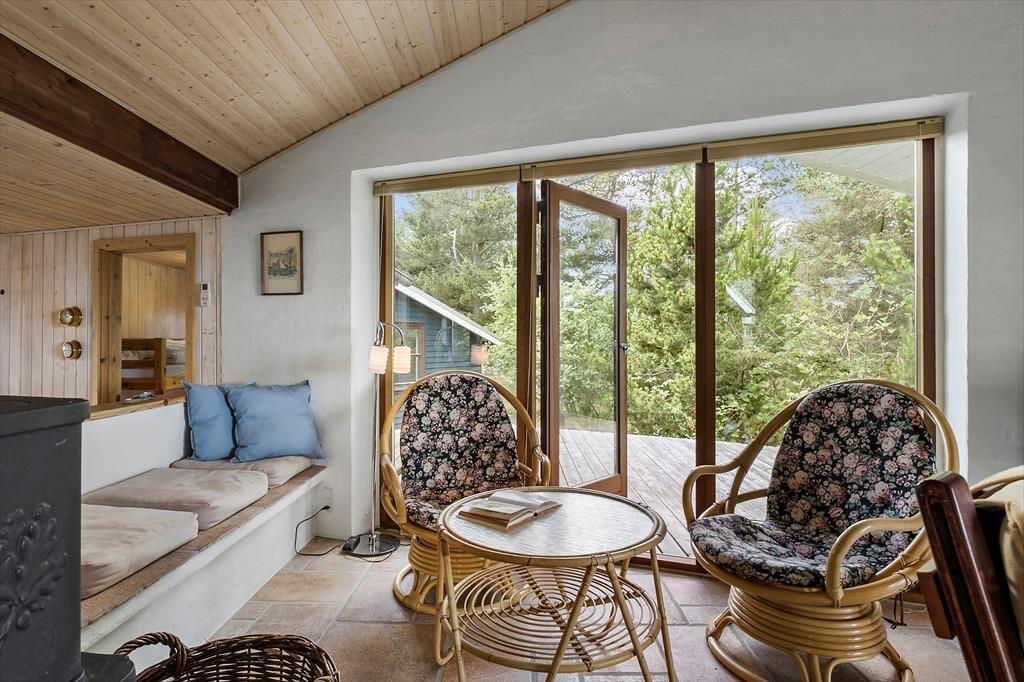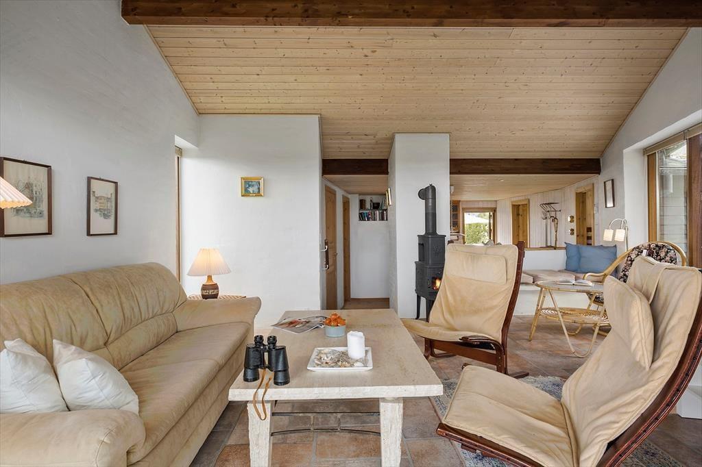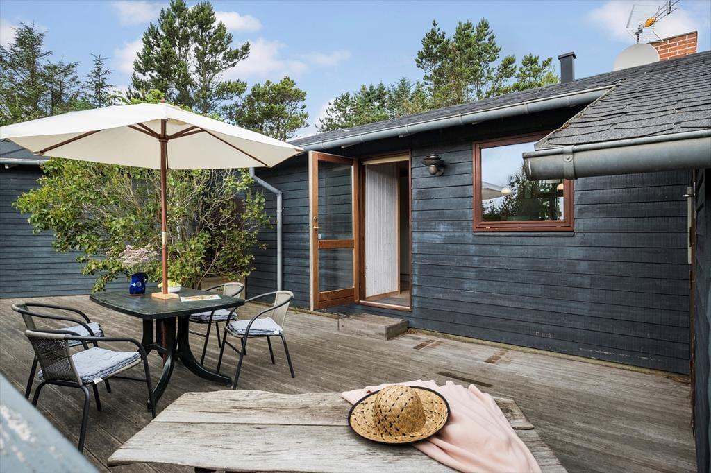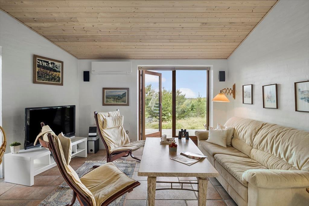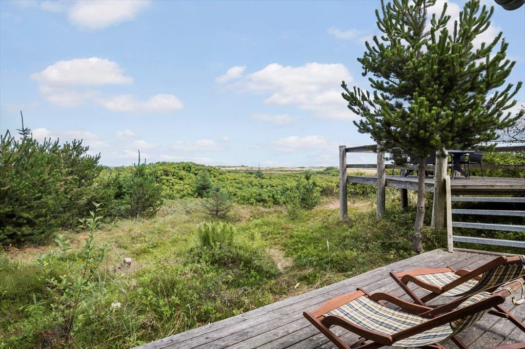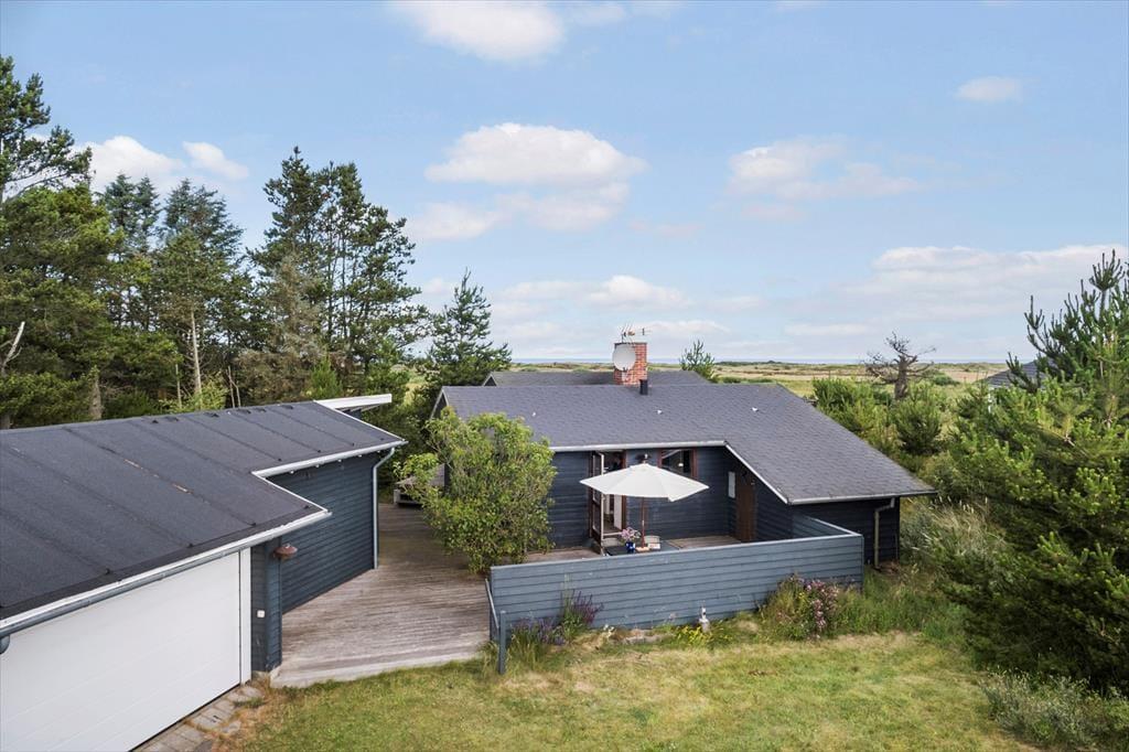Hier können Sie das Ferienleben unter freiem Himmel in vollen Zügen genießen. Das Haus verfügt über mehrere herrliche Terrassen, auf denen Sie den ganzen Tag über Sonne oder Windschutz finden. Die erhöhte Terrasse ist ein ganz besonderer Ort – hier können Sie Mahlzeiten mit Blick auf das Meer und die wunderschöne Dünenlandschaft genießen. Auf dem großen Naturgrundstück gibt es Platz, um in Liegestühlen zu entspannen, den Morgenkaffee in Ruhe zu trinken oder die Familie zu einem gemütlichen Grillabend zu versammeln. Die Umgebung ist wie geschaffen für lange Sommerabende, Vogelgesang und frische Meeresluft.