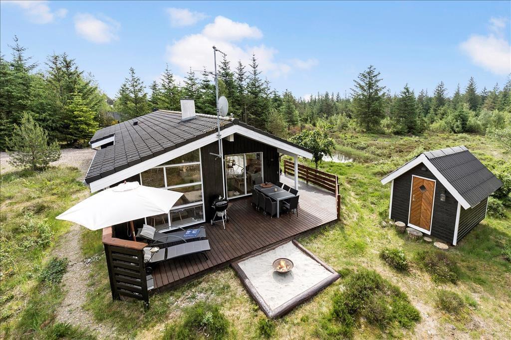 Das Ferienhaus liegt am Ende eines Weges, auf einem ausgesprochen schönen Naturgrundstück, das Sie mit einem freien Ausblick auf Heide und anderen schönen, abwechslungsreichen Bewuchs verwöhnt. Die Umgebung ist ruhig und schön und eignet sich hervorragend für alle, die viel Wert auf Frieden, Ruhe und attraktive Natur legen. An das Urlaubsdomizil schließt eine ansprechende, nach Süden gerichtete Holzterrasse. Hinzu gesellt sich eine teilweise überdachte Holzterrasse, die gen Südwesten weist. Auf dieser Terrasse können Sie sehr schön die lauen Sommerabende in entspannender Atmosphäre und einem köstlichen Essen vom Grill ausklingen lassen.