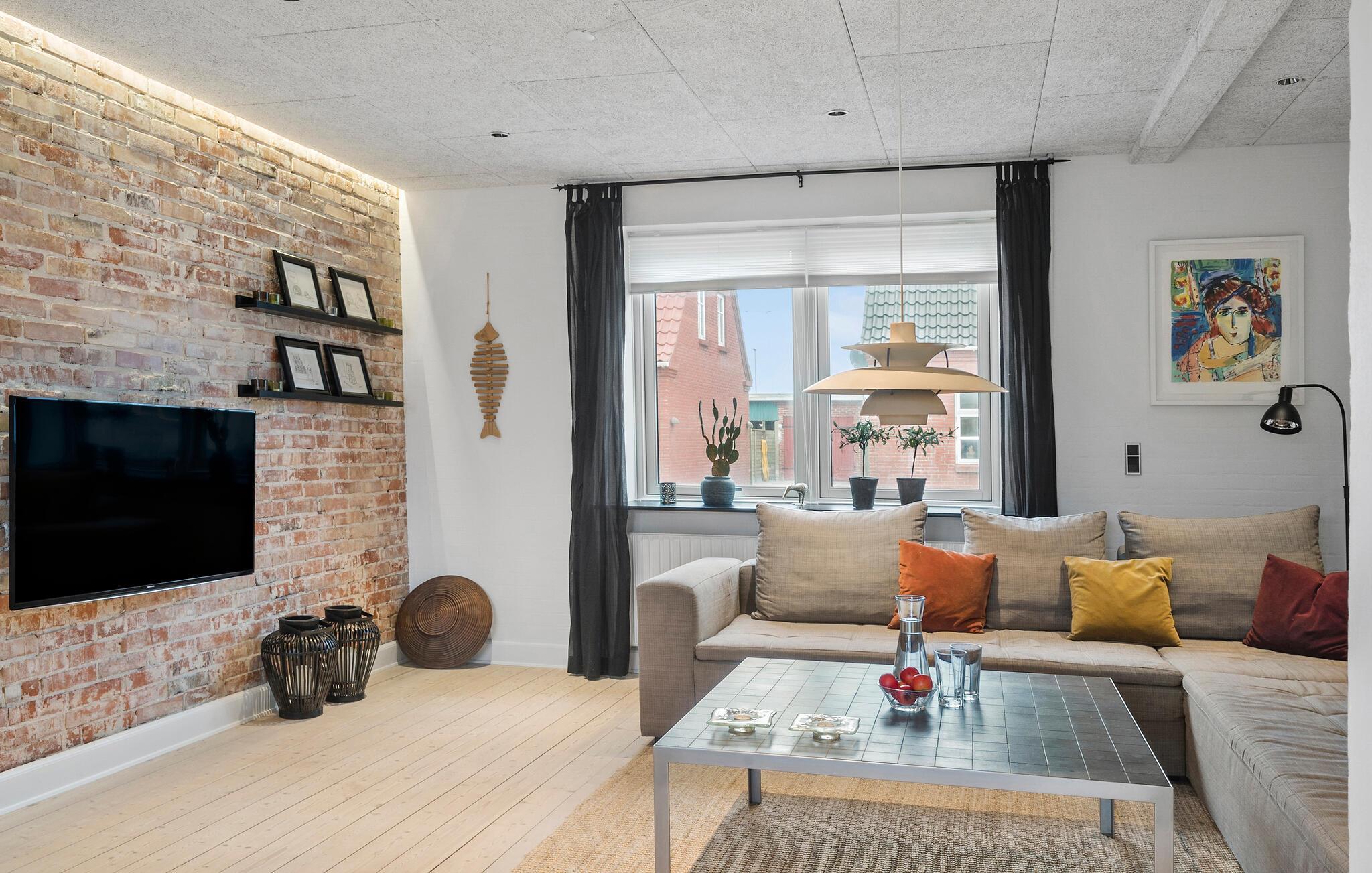 Erleben Sie eine erholsame Auszeit in diesem Ferienhaus in Thyborøn, das Ihnen Komfort und Gemütlichkeit in Strandnähe bietet. Das modern eingerichtete Haus, mit Platz für eine große Familie, besticht durch seine stilvolle Kombination aus skandinavischem Design und rustikalem Charme. Freuen Sie sich auf einen großzügigen Wohnbereich mit einer gemütlichen Sofaecke, einer offenen Ziegelwand und liebevoll ausgewählten Dekorationen. Nutzen Sie die hochwertige Küche mit modernen Geräten und ausreichend Arbeitsfläche, um kulinarische Highlights zu zaubern. Der Essbereich mit viel Tageslicht lädt zu langen Mahlzeiten mit der Familie ein.