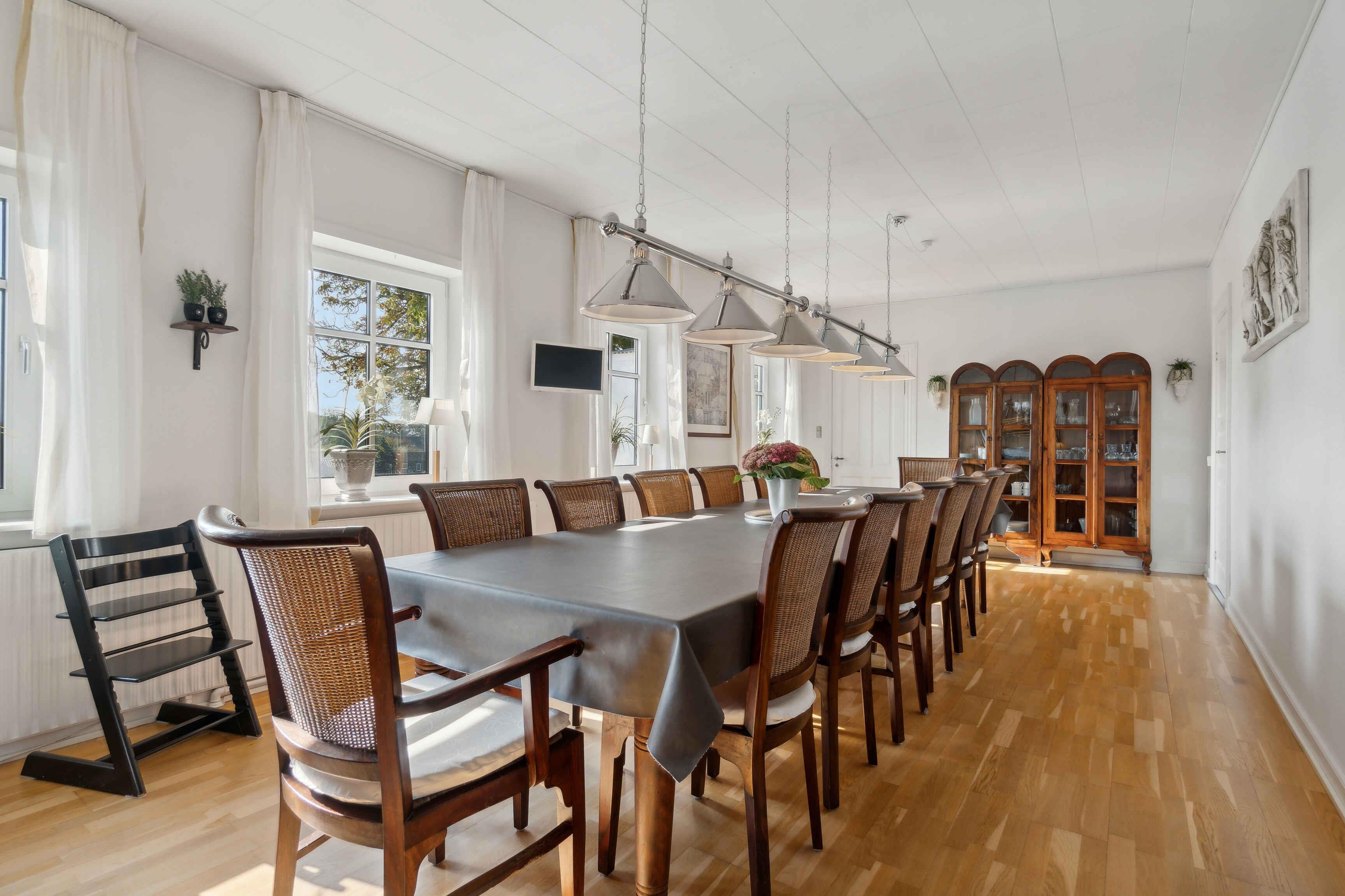 Willkommen in Thyholm, wo dieses Juwel eines Ferienhauses in angenehmer Gehentfernung zum Strand auf Sie wartet. Das Haus bietet viel Platz und gute Einrichtungen, sodass Sie mit einer größeren Gruppe reisen können, ohne auf Privatsphäre oder Komfort verzichten zu müssen. Es gibt Küchen sowohl im Erdgeschoss als auch im ersten Stock, sodass Sie selbst entscheiden können, ob Sie gemeinsam für die ganze Gruppe kochen oder sich aufteilen möchten. Im Aktivitätsraum können die Kinder mit Spielgeräten Spaß haben, und vielleicht möchten Sie die Familie zu Duellen am Tischfußball herausfordern? Im Erdgeschoss befindet sich der große, offene Wohnbereich, wo die Sofas zu gemütlichen Abenden mit Brettspielen oder einem guten Film einladen, wenn ein schöner Ferientag zu Ende geht. Für ein wenig zusätzliche Wellness können Sie im Whirlpool entspannen und zur Ruhe kommen. Zum Haus gehört ein schöner, großer Garten, in dem die Kinder auf dem Trampolin, der Schaukel oder im Sandkasten stundenlang spielen können, während Sie sich mit einem guten Buch auf einem Liegestuhl entspannen. An schönen Sommerabenden können Sie den Grill anheizen und die Lieblingsgerichte der Familie mit einem kühlen Getränk in der Hand zubereiten. Im Haus stehen zwei Fahrräder zur Verfügung, die Sie für Ausflüge nutzen können. Ein Urlaub am Limfjord bedeutet unvergessliche Naturerlebnisse, fantastische Landschaften, Badespaß und zahlreiche Aktivitätsmöglichkeiten für Jung und Alt. Mit flachem Wasser und sanften Wellen sind die Strände an der Venø Bucht besonders familienfreundlich. An der Handbjerg Marina gibt es auch die Möglichkeit zu surfen, und das Gebiet eignet sich ideal für Kajaktouren oder Stand-up-Paddling. Unternehmen Sie auch Rad- und Wandertouren durch eine vielfältige Natur mit Wäldern, Seen und Heide. Die Geddal Strandenge ist etwas ganz Besonderes. Vergessen Sie nicht, Venø zu besuchen, das mit einer abwechslungsreichen Natur, einer reichen Vogelwelt und gemütlichen kleinen Galerien beeindruckt. Freuen Sie sich auf einen Urlaub, von dem Sie nicht nach Hause zurückkehren möchten, mit diesem fantastischen Haus als Basis.