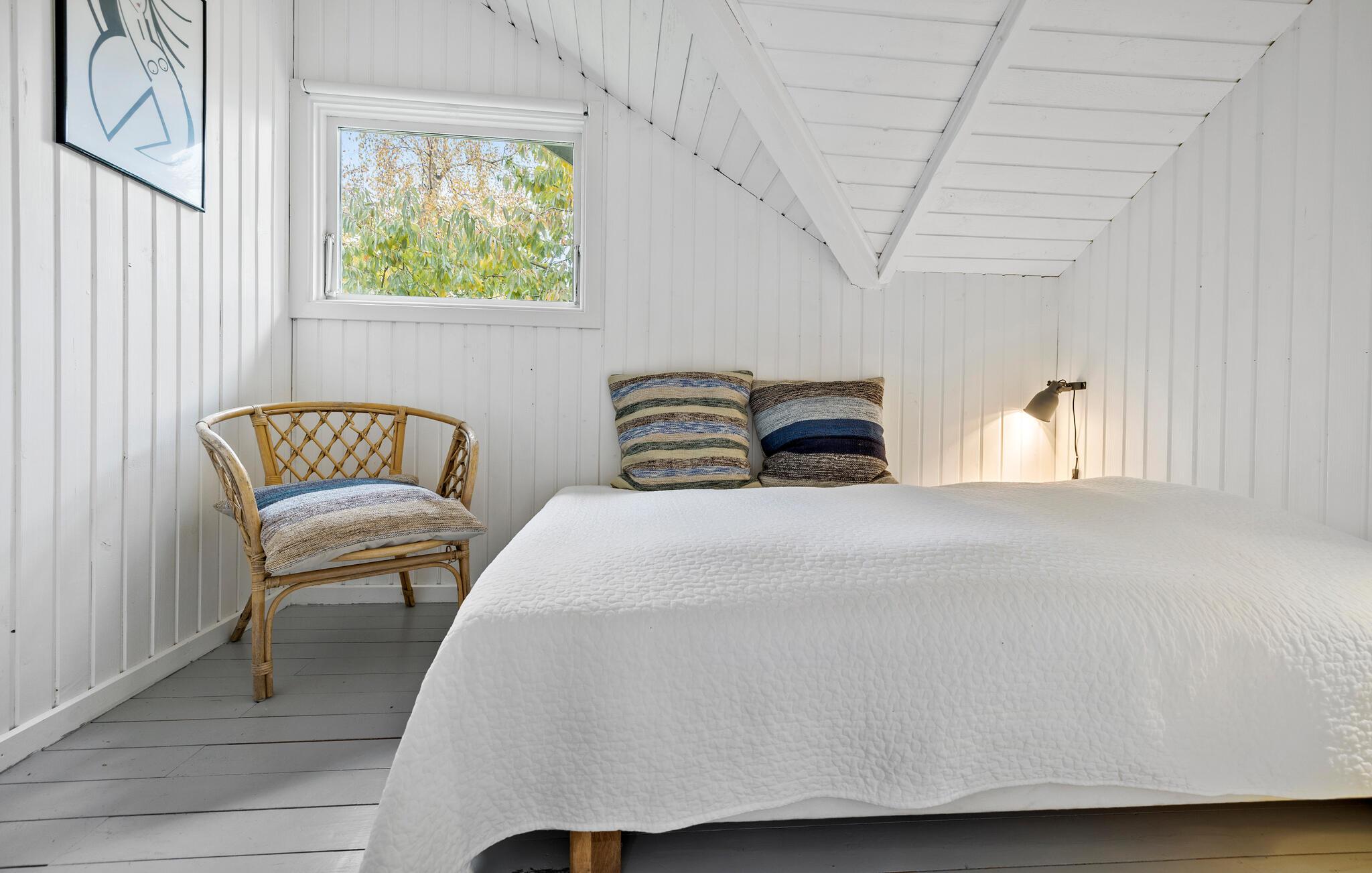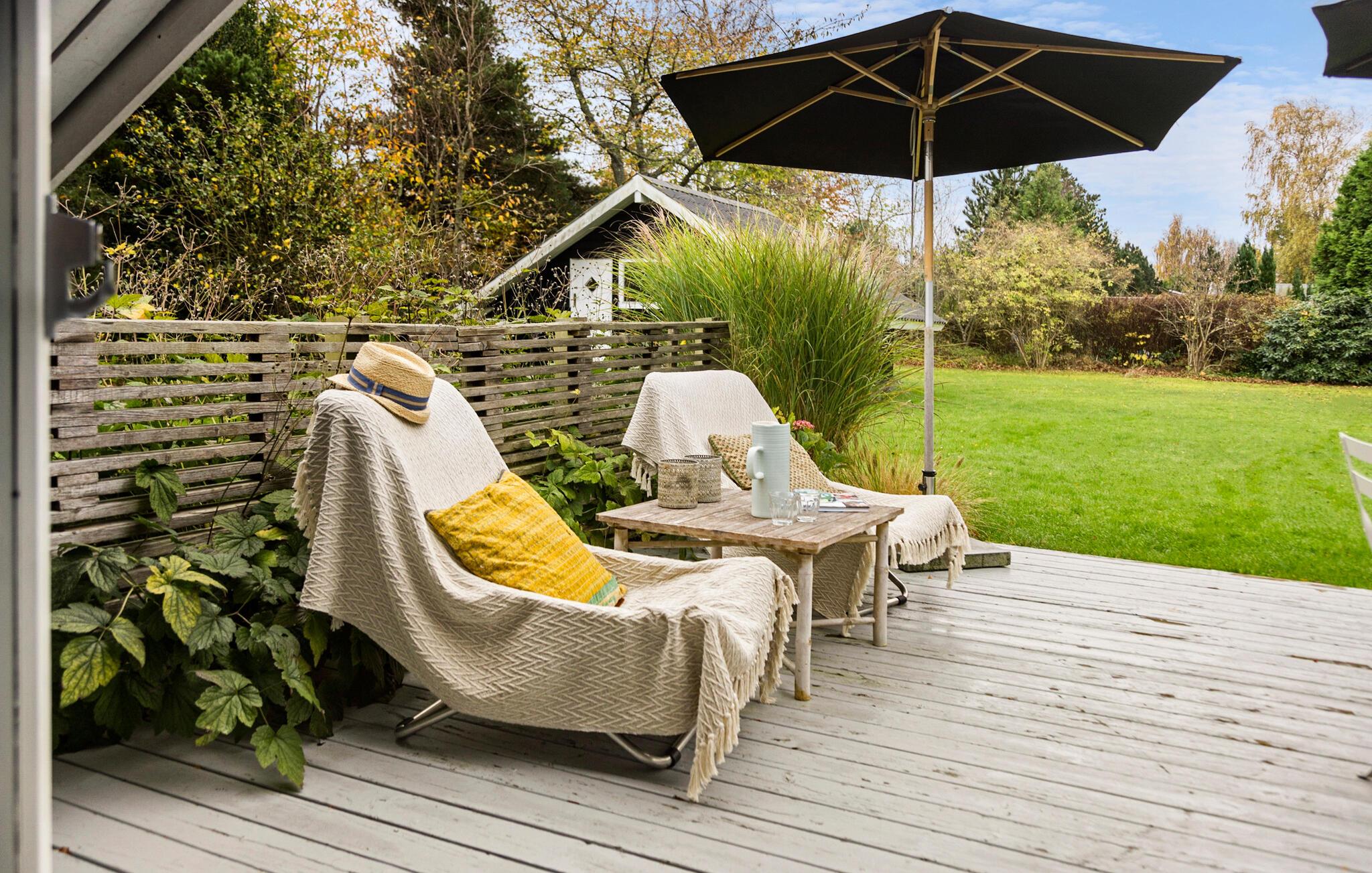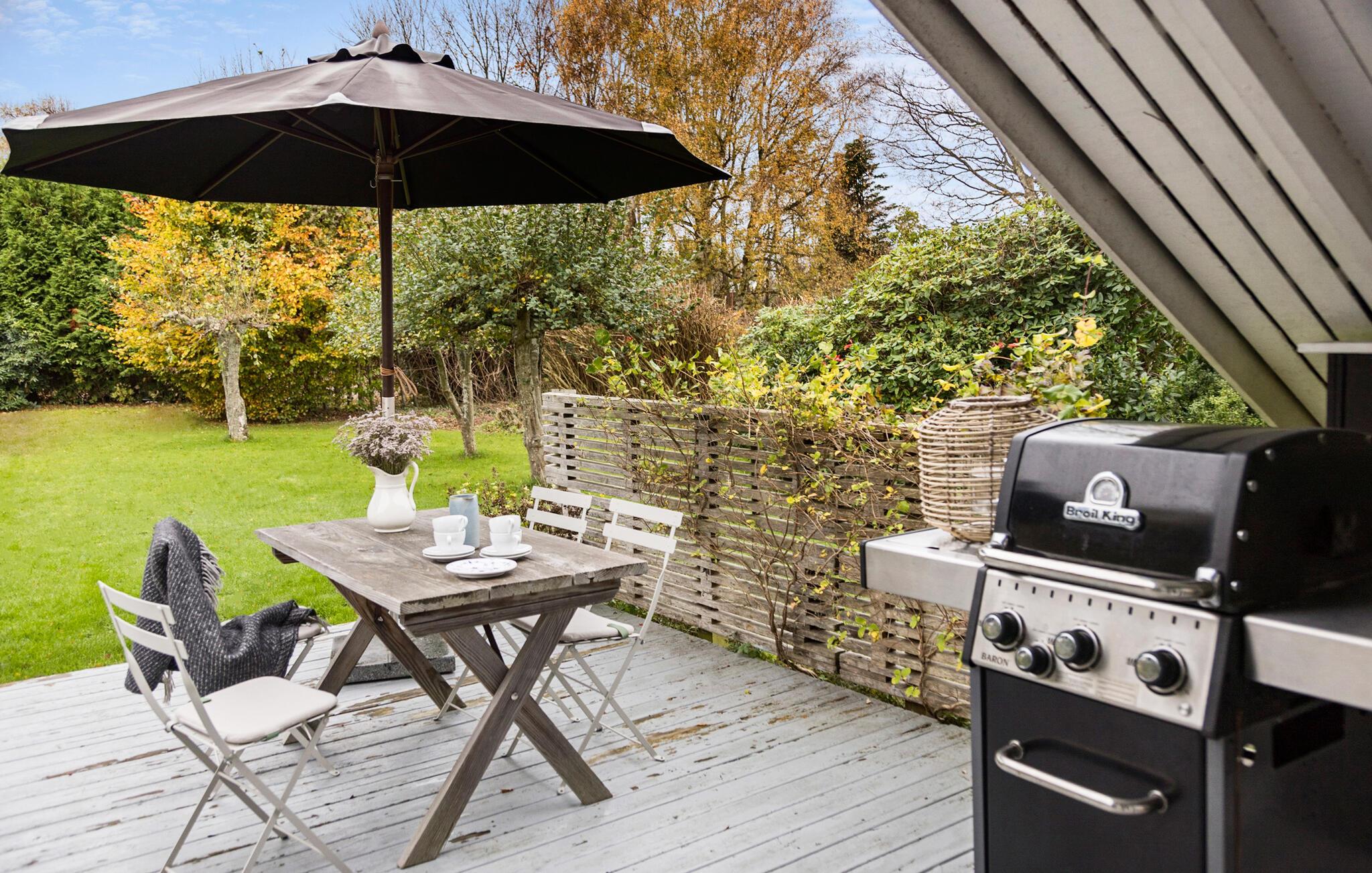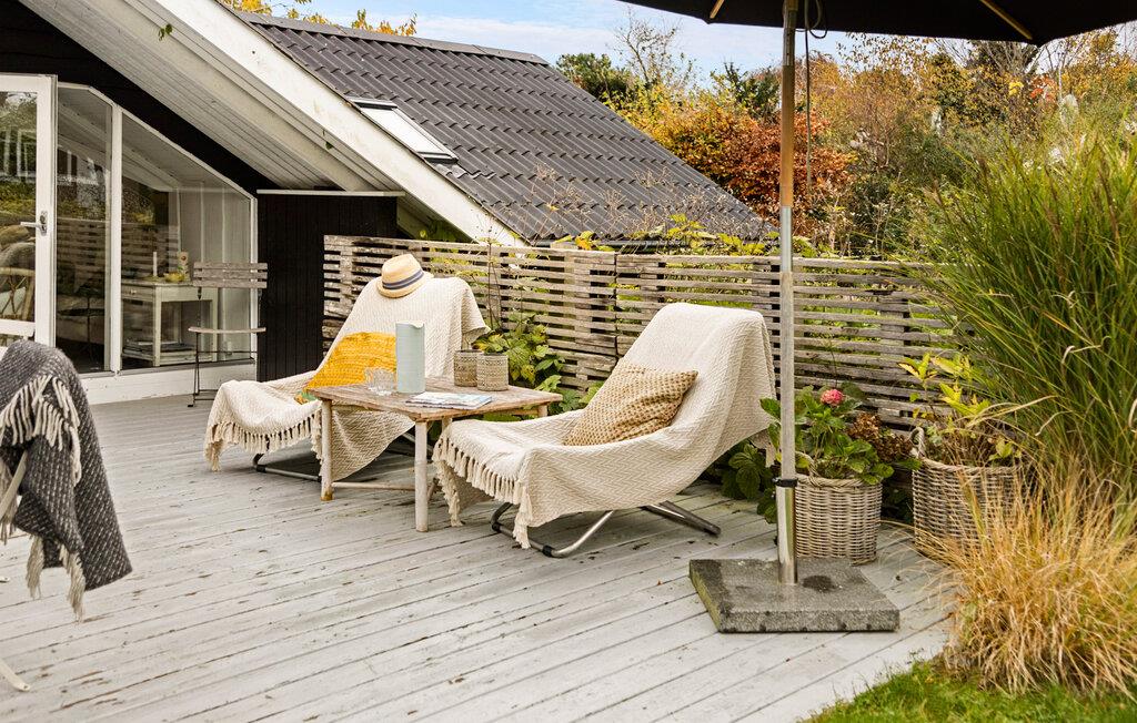 Ihr Ferienhaus vereint die klassisch-dänische Sommerhaus-Atmosphäre mit nordischer Tradition und modernem Design. Der helle Wohnraum mit viel Licht und dem schönen Blick in den Garten sorgt für eine ganz besondere Wohlfühlatmosphäre. Starten Sie Ihren Tag mit einer Tasse Kaffee auf der Terrasse und genießen Sie die Ruhe der Natur. In der stilvollen Küche können Sie kulinarische Köstlichkeiten zubereiten und diese am schönen Esstisch genießen. Der gemütliche Kaminofen lädt dazu ein, es sich auf dem Sofa mit einem Buch gemütlich zu machen und einfach zu entspannen.