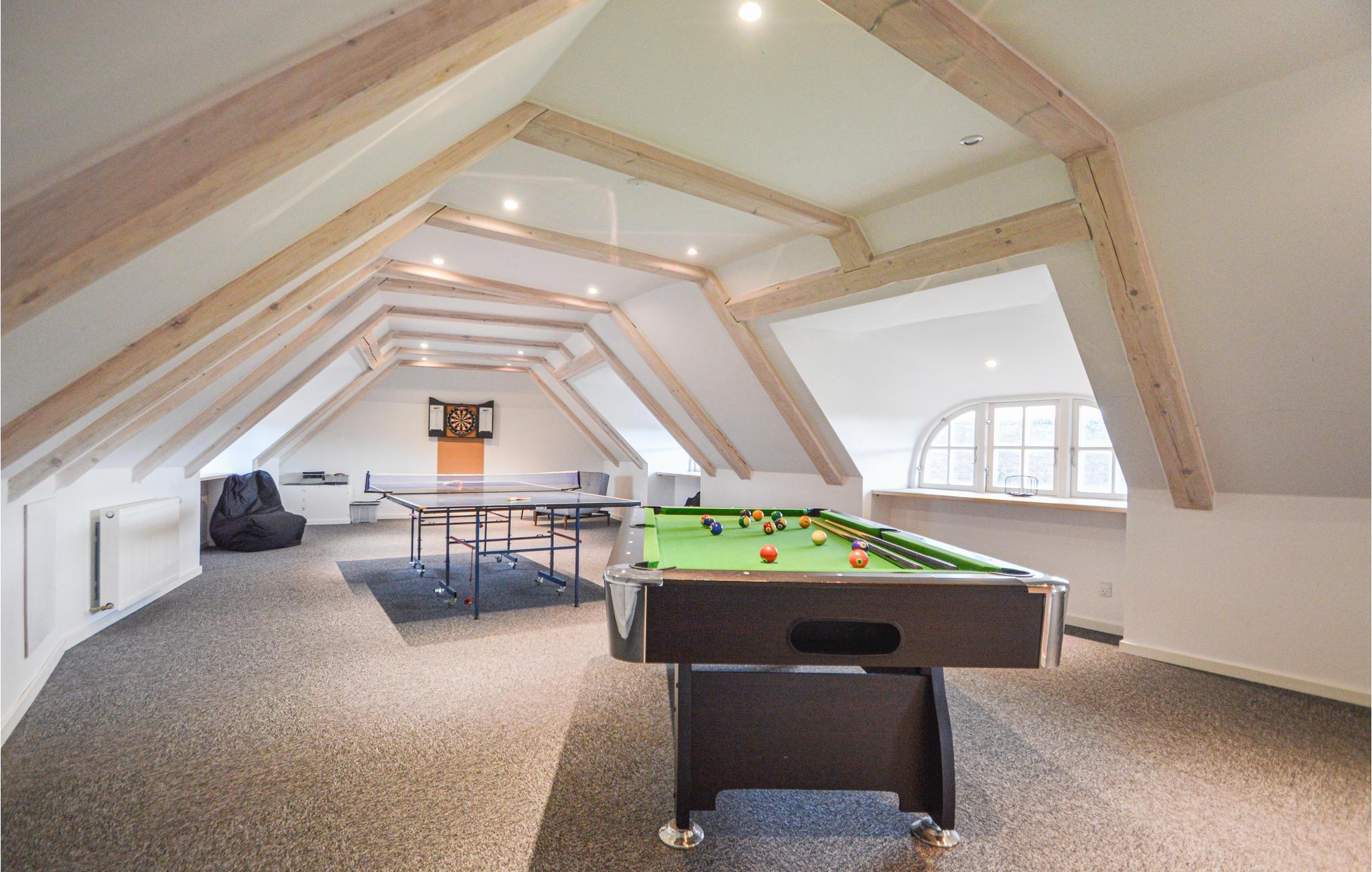 Im Haus gibt es 2 Schlafabteilungen mit jeweiligem Badezimmer, von denen das eine mit Sauna ausgestattet ist. Im 1. Stock liegt ein Aktivitätsraum mit Kicker, Tischtennis,Darts und Billard.