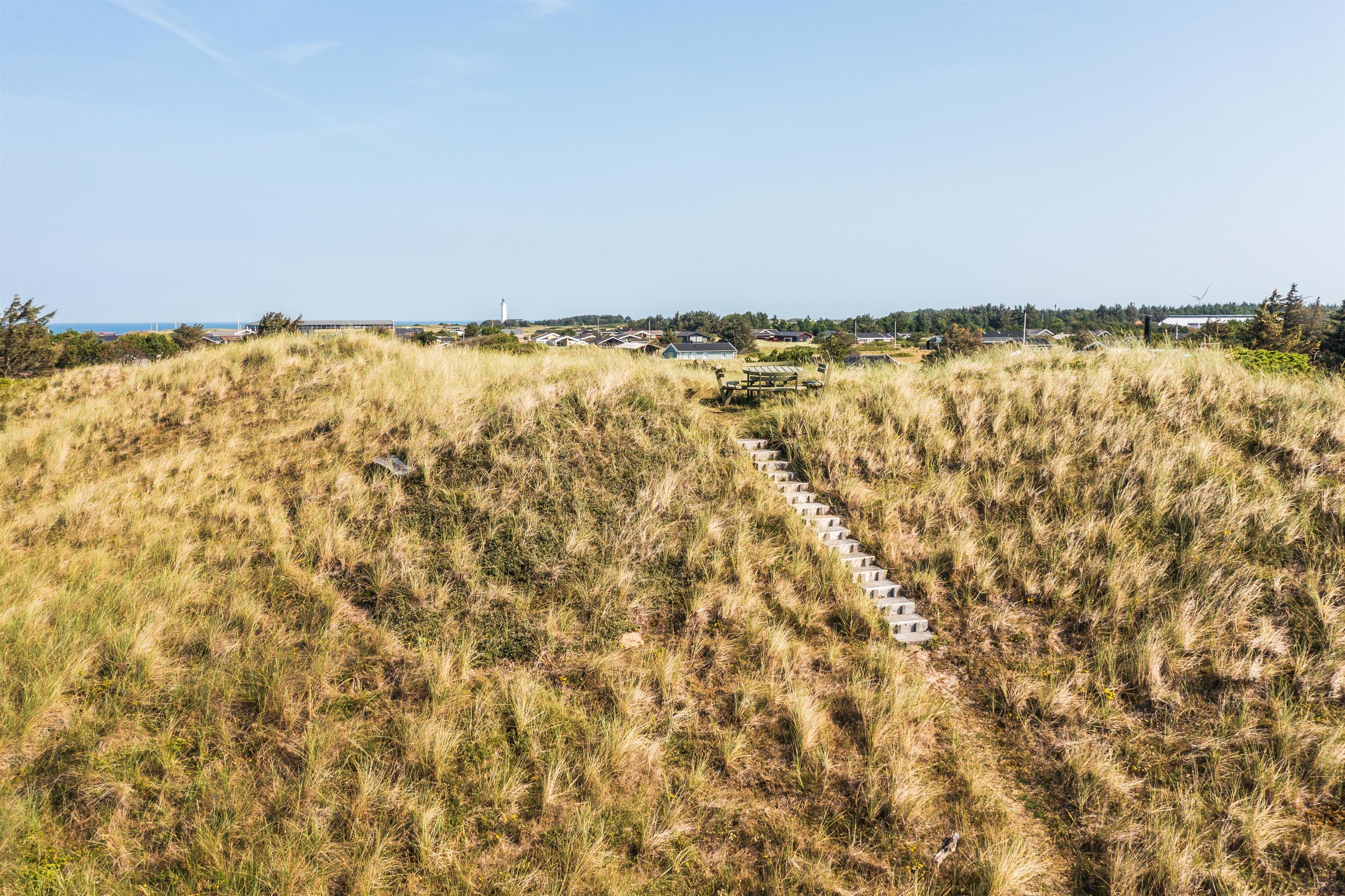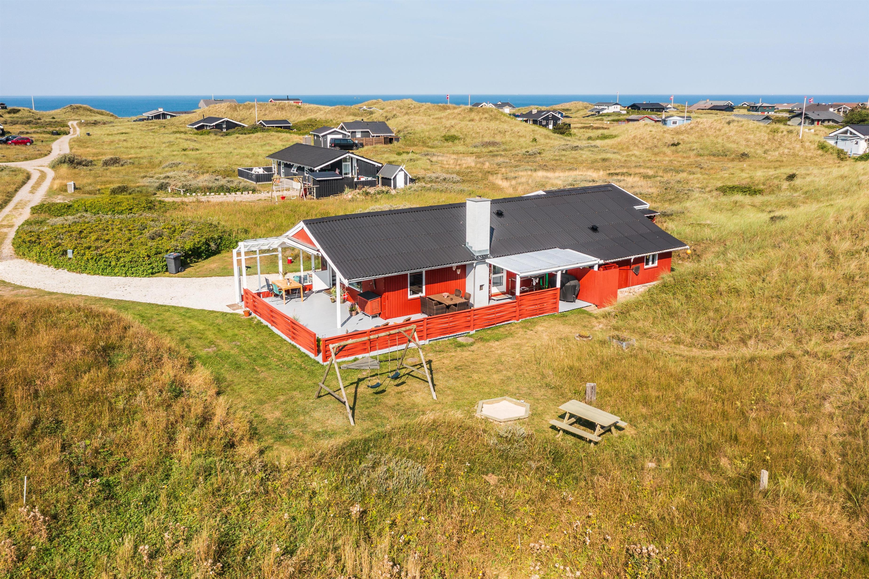 Das Haus liegt auf einem schönen Naturgrundstück, auf dem Sie die Ruhe und den Charme der Umgebung erleben können. Der große Rasen lädt zu Ballspielen und Spielmöglichkeiten ein, während die geräumigen Terrassen den perfekten Rahmen für Entspannung bieten. Hier finden Sie sowohl eine überdachte Terrasse für die Tage, an denen Sie Schatten oder Windschutz wünschen, als auch offene Terrassen, auf denen Sie die Sonne genießen können. Nahe dem Haus führt eine Treppe zu einem fantastischen Aussichtspunkt mit einem Tisch-Bank-Set – der ideale Ort, um den Sonnenuntergang über der Westküste zu genießen, während der Himmel in wunderschönen Farben leuchtet. Die Natur rund um das Ferienhaus ist reich an Wildtieren, und es ist nicht ungewöhnlich, Fasane oder Rehe vorbeiziehen zu sehen.