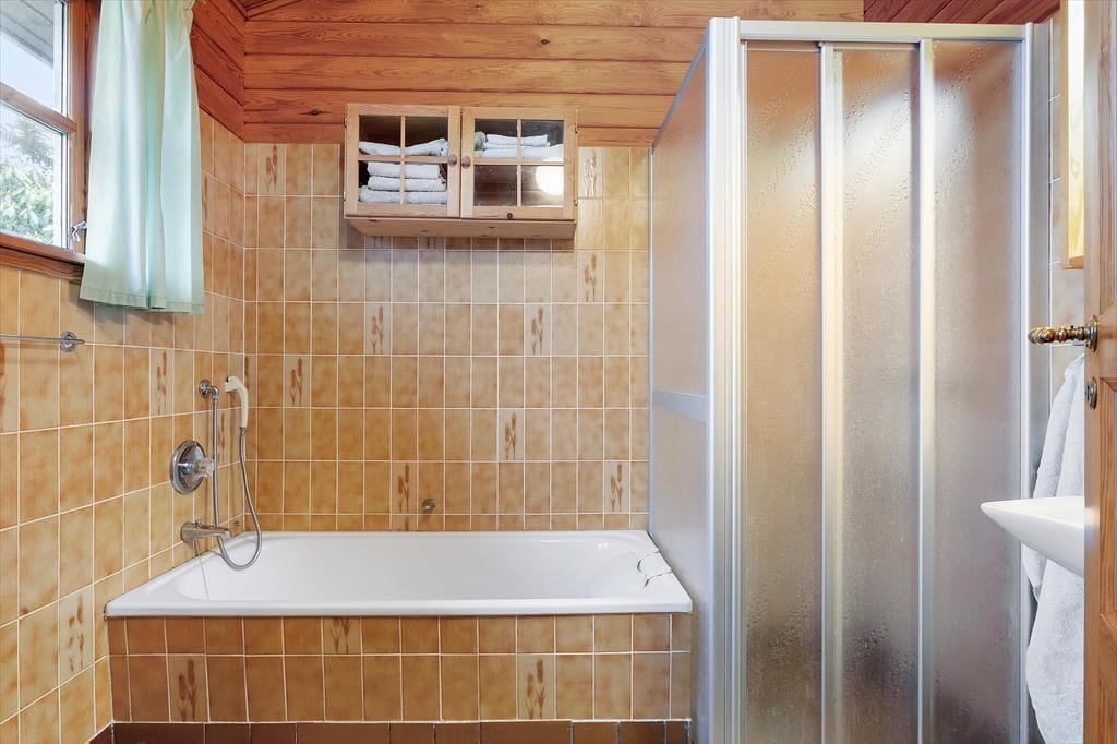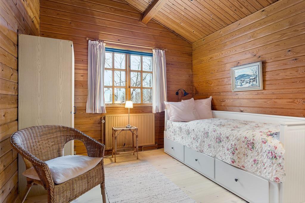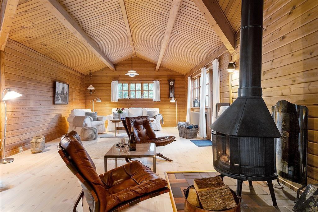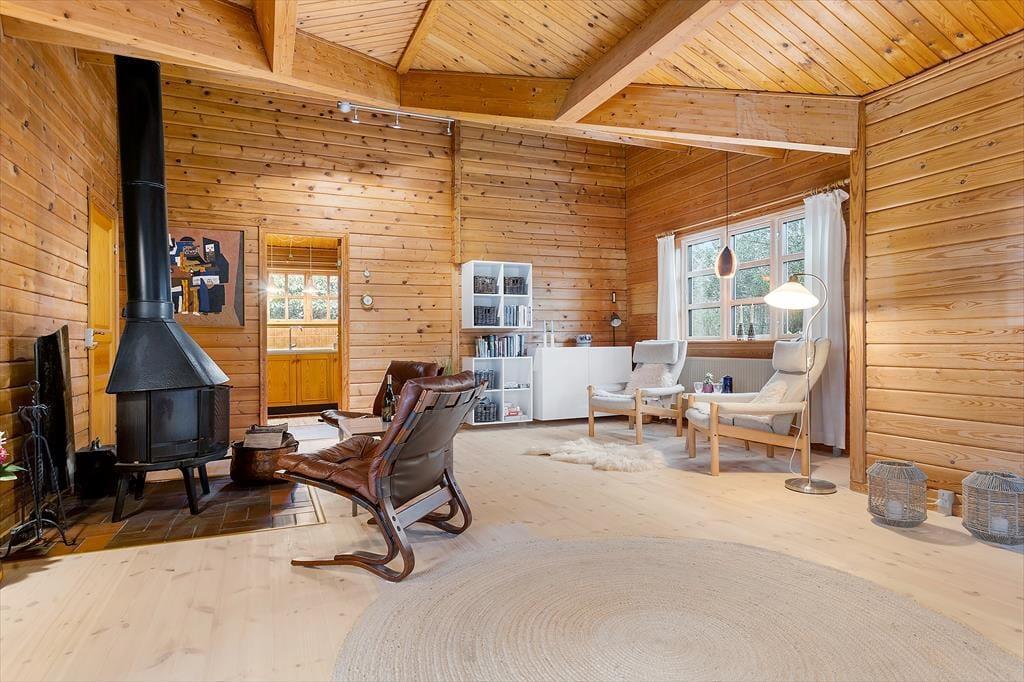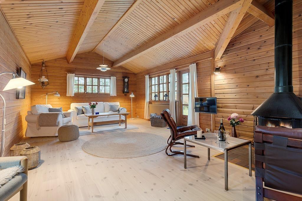 Drinnen empfängt dich ein heller und geräumiger Wohnbereich, in dem die offene Decke bis zum Giebel eine wunderbare Raumwirkung schafft. Die großen Fenster lassen viel Tageslicht herein und sorgen für eine einladende Atmosphäre, in der du dich sofort zuhause fühlst. Der Kaminofen in der Ecke spendet Wärme und Gemütlichkeit – besonders an kühleren Abenden, wenn die Flammen knistern, während du es dir mit einem guten Buch oder einem Film auf dem Sofa bequem machst. Die Küche ist separat, aber in direkter Verbindung zum Wohnzimmer, sodass du weiterhin am Gespräch teilnehmen kannst, während du eine leckere Mahlzeit zubereitest. Das Ferienhaus ist gepflegt und strahlt eine klassische Sommerhausatmosphäre aus, die sofort für ein Gefühl von Geborgenheit sorgt.