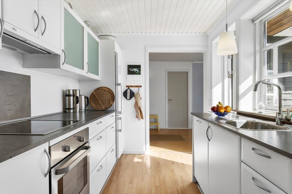 Die Einrichtung des Hauses strahlt echte Ferienhaus-Atmosphäre aus. An alles wurde gedacht, und die gemütlichen Ecken laden zu Nähe, Gesellschaftsspielen und Entspannung ein. Der Kaminofen im Wohnzimmer sorgt für Wärme und eine besondere Ruhe, wenn die Flammen hinter der Glasscheibe tanzen und der Wind draußen ums Haus weht. Der Grundriss ist sowohl funktional als auch geräumig, und mit separater Küche und einem schönen Gemeinschaftsraum lässt sich das Ferienleben leicht miteinander gestalten – ohne sich gegenseitig im Weg zu stehen. Die Küche ist praktisch eingerichtet und bietet genügend Platz für die kulinarischen Ferienfreuden, während die übrigen Wohnbereiche sich perfekt für ruhige oder gesellige Stunden eignen. Die drei Schlafzimmer sind gemütlich gestaltet und bieten eine ideale Raumaufteilung für bis zu sechs Personen – egal, ob du mit der Familie oder Freunden unterwegs bist. Alles in allem ein einladendes und stimmungsvolles Ferienhaus mit einer wohltuenden Atmosphäre.