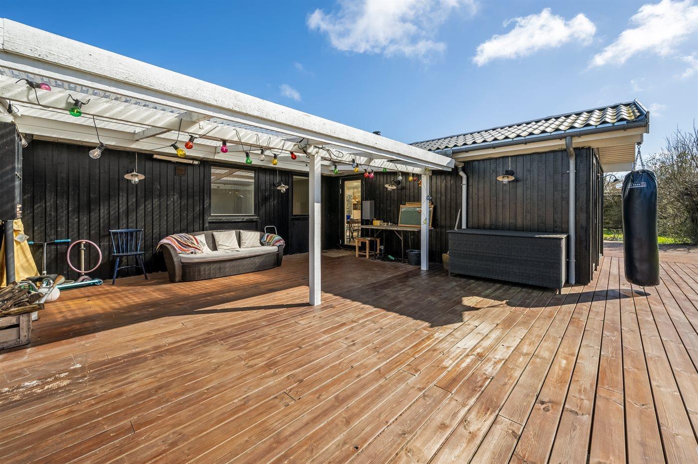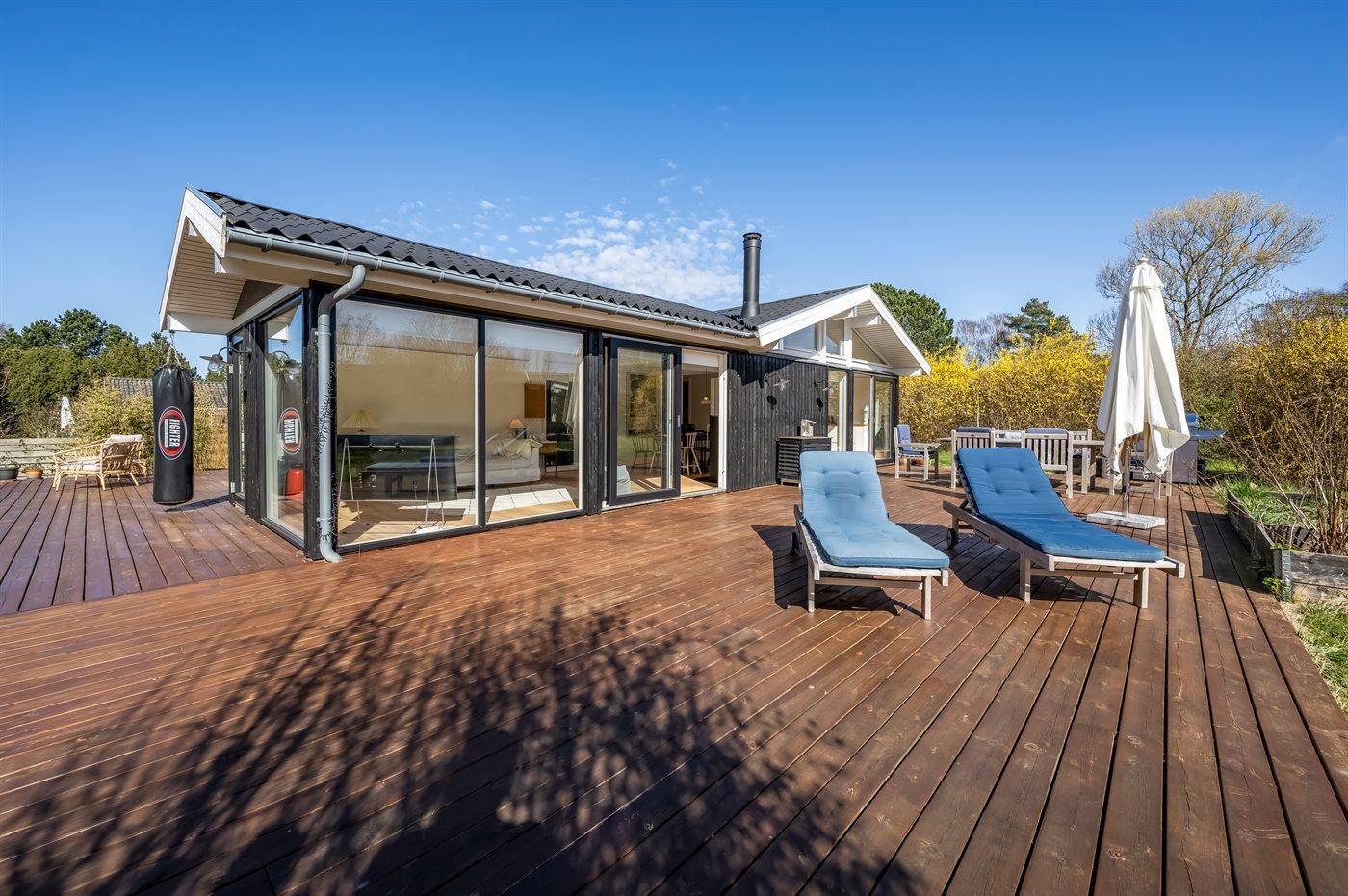 Ein schönes Ferienhaus mit Platz für Entspannung und Gemütlichkeit. Große Wohnküche mit viel Licht und Luft. Blick auf und Zugang zum Garten – sowie zur überdachten Terrasse. Drei Schlafzimmer. Ein schönes Badezimmer.