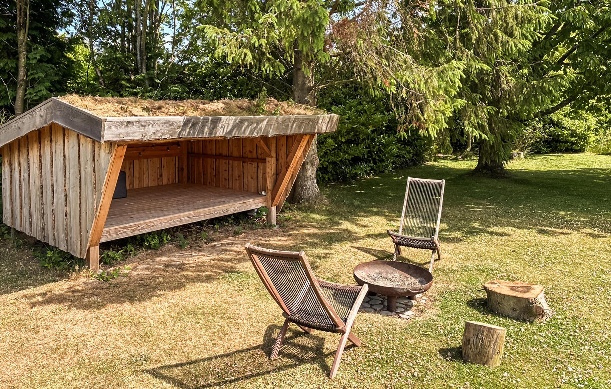 Servieren Sie an sonnigen Tagen ein herrliches Frühstück im Schatten der Bäume und gönnen Sie den jungen Gästen Spaß beim Toben auf der weitläufigen Rasenfläche. Machen Sie es sich bei Regen im gemütlichen Unterstand mit einem Buch bequem und nutzen Sie die Feuerstelle für stimmungsvolle Abende unter dem Sternenhimmel.