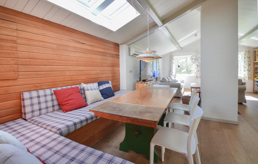 Im Essbereich neben der Küche gibt es Küchenbänke und viel Platz für Spaß und Spiel mit der ganzen Familie. Sie können auch auf den weichen Sofas vor dem Fernseher oder dem Holzofen entspannen, wenn das Wetter mal nicht mitspielt.